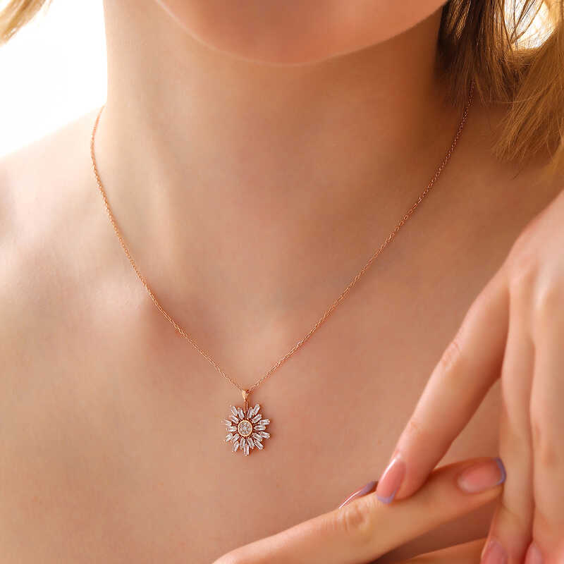 Kadınların ışıltısı, berraklığı kar tanesine benzetilip özel olarak tasarlanmıştır. Kar tanelerinin her birinin kadınlar gibi eşsiz ve ayrı kıymette olması onları özel kılan bir diğer özelliktir. Kar tanesinin asilliği her dönemde dikkat çekmeyi başarmıştır. Bunun yanında insanların tıpkı kar taneleri gibi birbirlerine zarar vermeden de mutlu bir şekilde yaşayabileceklerini sembolize etmektedir. Bu şık kolye; doğum günü hediyesi, sevgililer günü hediyesi veya annelere hediye olarak özel günlerde tercih edilebilecek mükemmel bir seçenektir. Kolye, 925 ayar gümüşten imal edilmiştir. Gümüş üzerine rose kaplama yapılmıştır. Rose kaplama yapılan ürünler parlaklığını uzun süre muhafaza eder, gümüşü pembe renge dönüştürür ve oksitlenmesi gecikir. Tüm gümüş kadın kolyelerde olduğu gibi bu gümüş rose baget taşlı kar tanesi kadın kolye de tamamı el emeği ile üretilmiştir. Gümüş ve değerli taşlar nedeniyle belirtilen ortalama ürün ağırlığında ± %10 sapma olabilmektedir.