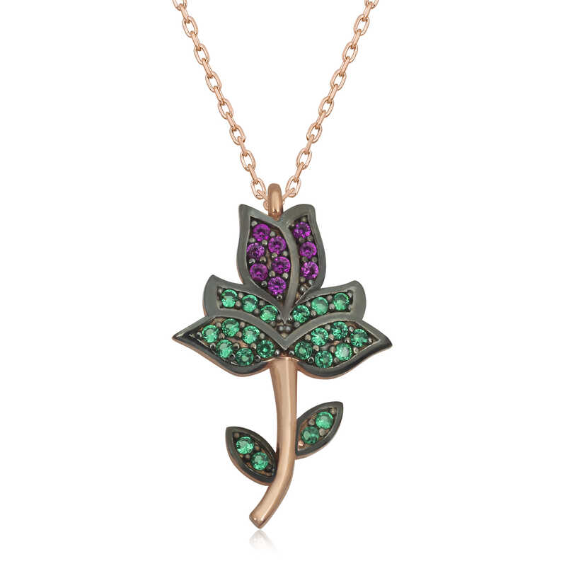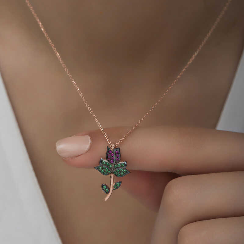 Lale rengi ve şeklinden dolayı “sevgilinin yüzüne, yanağına ve dudağına” benzetilen eşsiz bir çiçektir, aşkı ve sevgiliyi sembolize eder. Bu lale motifli kadın kolye modelimiz 925 ayar gümüşten imal edilmiştir. Üzerinde bulunan taşlar zirkondur. Gümüş üzerine rose kaplama yapılmıştır. Rose kaplama yapılan gümüş kadın kolye modelleri parlaklığını uzun süre muhafaza eder, her zaman ilk günkü gibi kullanılabilir. Kolyedeki gümüş zincir uzunluğu ortalama 45 cm’dir. Bu rose kaplama lale kadın kolyesi el emeği ile üretilmiştir. Gümüş ve değerli taşlar nedeniyle belirtilen ortalama ürün ağırlığında ± %10 sapma olabilmektedir.
