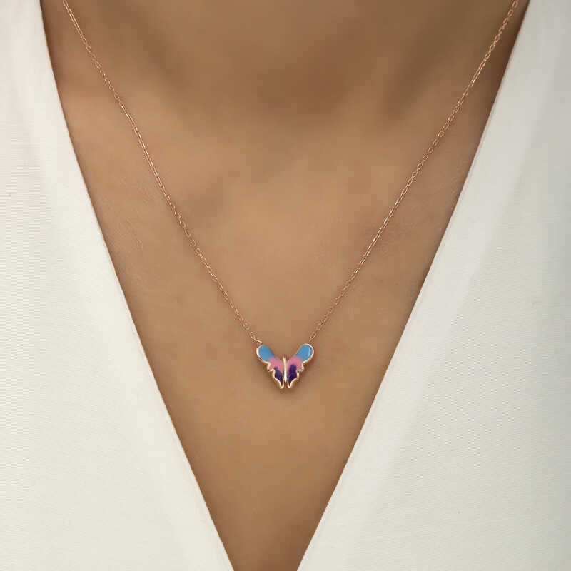 Özgürlüğü masumiyeti ve saflığı simgeleyen kelebekler, tertemiz sevginin ve aşkın ifadesidir. Bahar kelebekleri kolye anlam itibari ile aşkın küçük bir kıvılcım ile başladığı daha sonra büyük bir sabır ile büyüdüğü ve en sonunda ilan-ı aşkı ifade eder. Sizin olduğu kadar sevdiklerinizin de keyifle takacağı minimal kelebek bayan kolye en güzel hediyelerden biri olacaktır. Kolye 925 ayar gümüşten imal edilmiştir. Gümüş üzerine rose kaplama yapılmıştır. Rose kaplama yapılan gümüş bayan kolyeler parlaklığını uzun süre muhafaza eder, ve oksitlenmeyi geciktirir. Kolye üzerinde bulunan renkler mine işlemesidir. Gümüş olan zincir boyu ortalama 45 cm"dir. Tüm gümüş bayan kolyelerde olduğu gibi gümüş minimal kelebek bayan kolye de el emeği ile üretilmiştir. Gümüş ve değerli taşlar nedeniyle belirtilen ürün ağırlığında ± %10 sapma olabilmektedir.