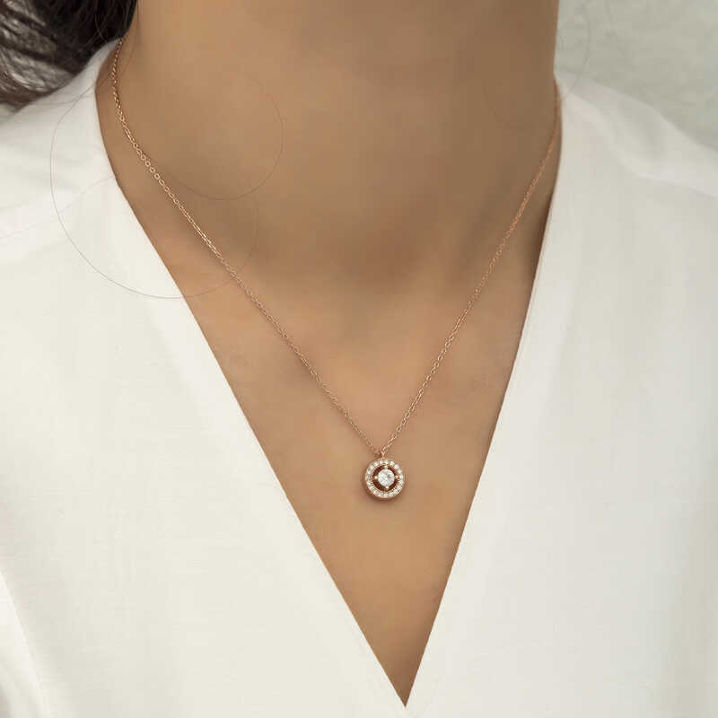 Gümüş Rose Minimal Yuvarlak Tek Taş Bayan Kolye