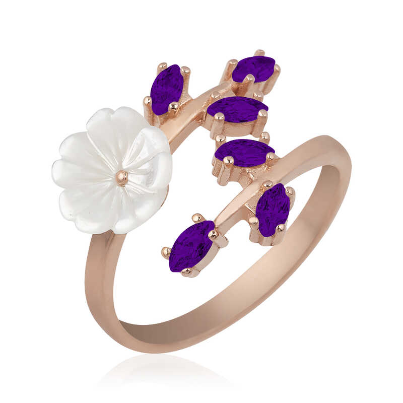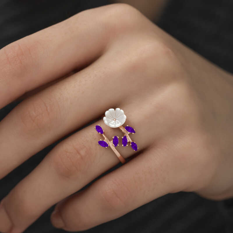 Gümüş Rose Mor Yapraklı Bahar Çiçeği Yüzük