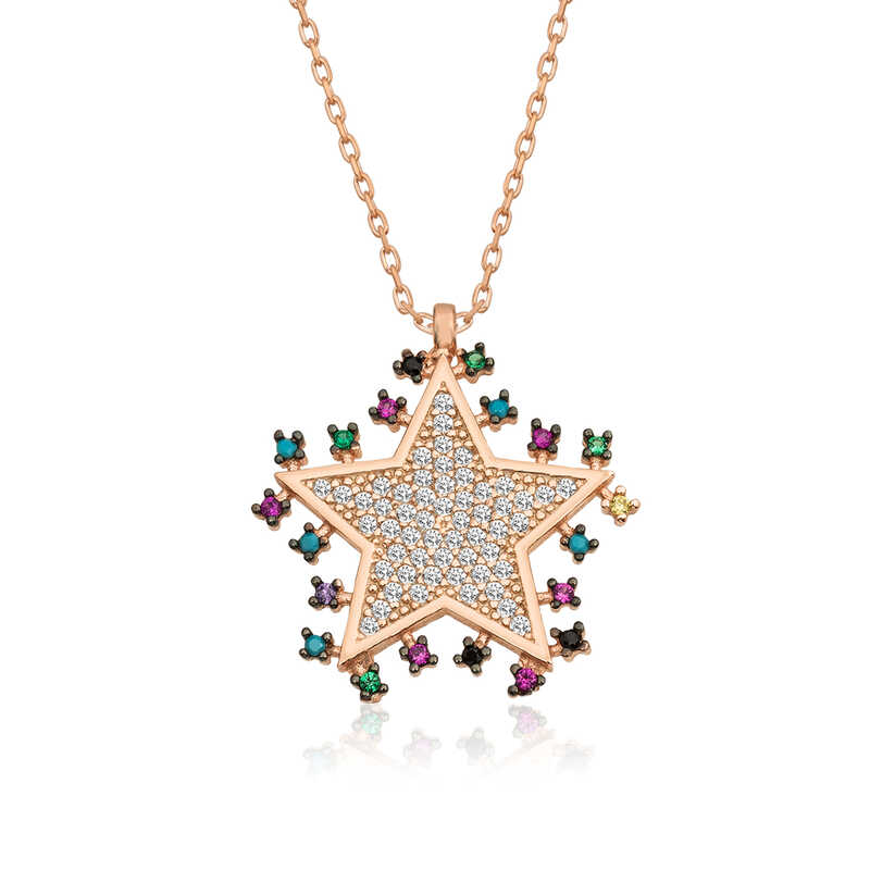 Yıldız, pek çok toplumda ve öğretide şans getirildiğine inanılan uğurlu bir semboldür. Venüs Gezegeninin enerjisini taşır. Venüs Gezegeni, aşk ve aşk enerjisinin de temsilcisidir. Bu şık renkli parlayan yıldızdan oluşan kolye; doğum günü hediyesi, sevgililer günü hediyesi veya özel günlerde tercih edilebilecek mükemmel bir seçenektir. Gümüş parlayan yıldız bayan kolye 925 ayar gümüşten imal edilmiştir. Bu kolye üzerinde rose kaplama vardır. Rose kaplama yapılan gümüş bayan kolye modelleri parlaklığını uzun süre muhafaza eder. Tüm gümüş bayan kolye modellerimizde olduğu gibi gümüş rose parlayan yıldız bayan kolye modeli de el emeği ile üretilmiştir. Gümüş ve değerli taşlar nedeniyle belirtilen ortalama ürün ağırlığında ± %10 sapma olabilmektedir.