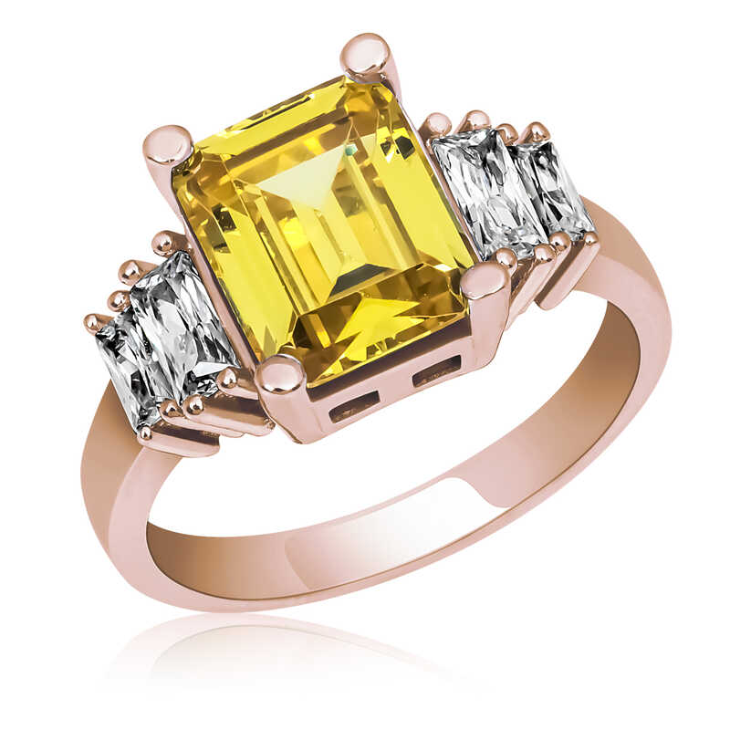Işıl ışıl baget taşlarla süslenmiş bu şık yüzük modeli; doğum günü hediyesi, sevgililer günü hediyesi veya annelere hediye olarak özel günlerde tercih edebileceğiniz çok şık bir seçenektir.Yüzük 925 ayar gümüşten imal edilmiştir. Gümüş üzerine rose kaplama yapılmıştır. Rose kaplama yapılan gümüş yüzükler parlaklığını uzun süre muhafaza eder, oksitlenmesi gecikir. Üzerinde bulunan taşlar bagettir. Tüm bayan gümüş yüzüklerde olduğu gibi gümüş sarı baget taşlı bayan yüzük modeli de el emeği ile üretilmiştir. Gümüş ve değerli taşlar nedeniyle belirtilen ortalama ürün ağırlığında ± %10 sapma olabilmektedir.