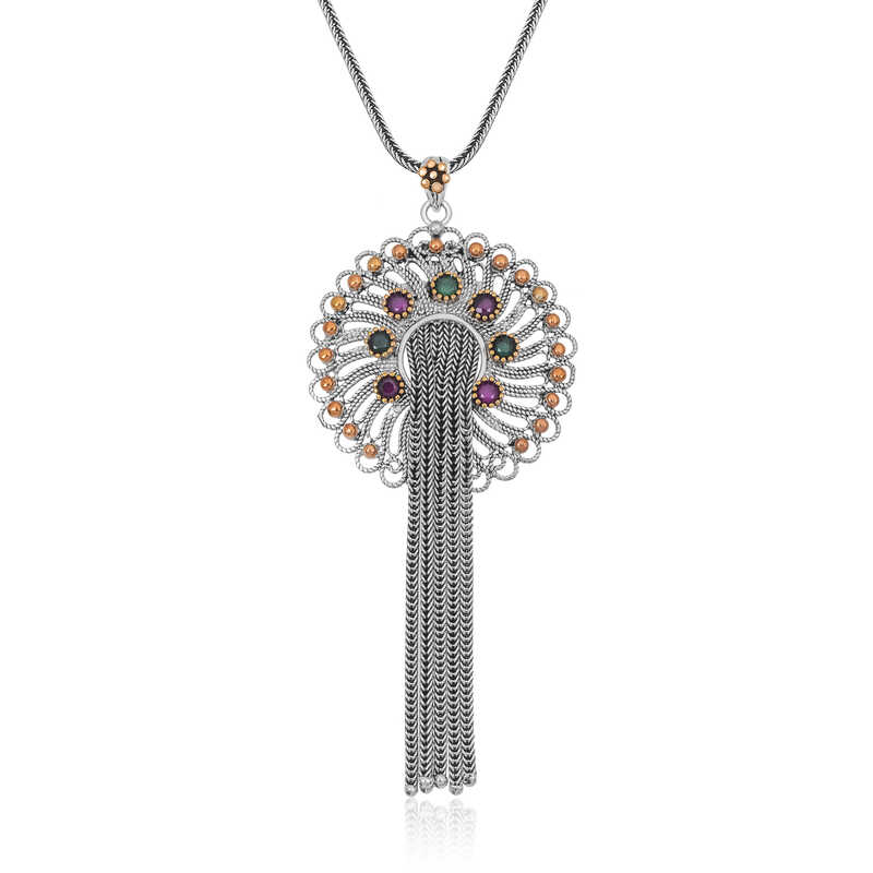 Gümüş Telkari Yakut Zümrüt Renkli Taşlı Kadın kolye Telkari Kolyeler Gümüş Telkari Yakut Zümrüt Renkli Taşlı Kadın kolyeBu özel tasarım el yapımı telkari kadın kolye modeli 925 ayar gümüşten imal edil