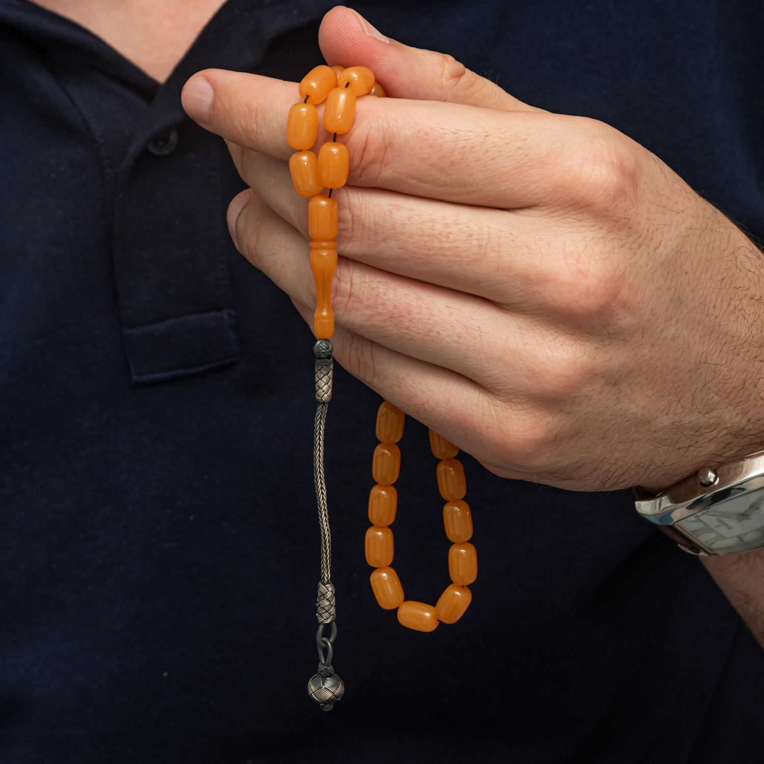 Zarif kapsül kesim taneleri ve el işçiliği gümüş top kazaz püskülüyle öne çıkan bu sıkma kehribar tesbih, hem günlük kullanımda hem koleksiyonlarda şıklığı ve kaliteyi bir araya getiriyor. Gösterişten