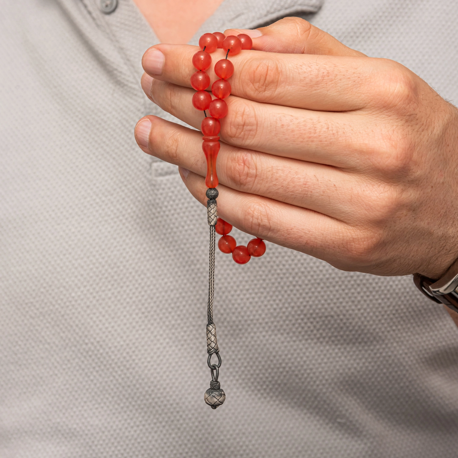 Zarif işçiligi ve klasik duruşuyla öne çıkan Sıkma Kehribar Tesbih, geleneksel tesbih sanatının modern bir yansımasıdır. Canlı kırmızı tonlara sahip yuvarlak kesim taneleri, elde rahat çekim sağlayacak şekilde özenle hazırlanmıştır.Tesbihin ucunda yer alan gümüş top detaylı kazaz püskül, el işçiliğiyle örülmüş olup ürüne estetik ve değer katar. Günlük kullanımın yanı sıra koleksiyonluk ve hediye alternatifi olarak da ideal bir seçimdir.Şıklığı, geleneksel dokusu ve kaliteli işçiliği bir arada sunan bu özel tesbih, kehribar severler için vazgeçilmez bir parçadır. Gümüş ve değerli taşlar nedeniyle belirtilen ürün ağırlığında ± %10 sapma olabilmektedir.