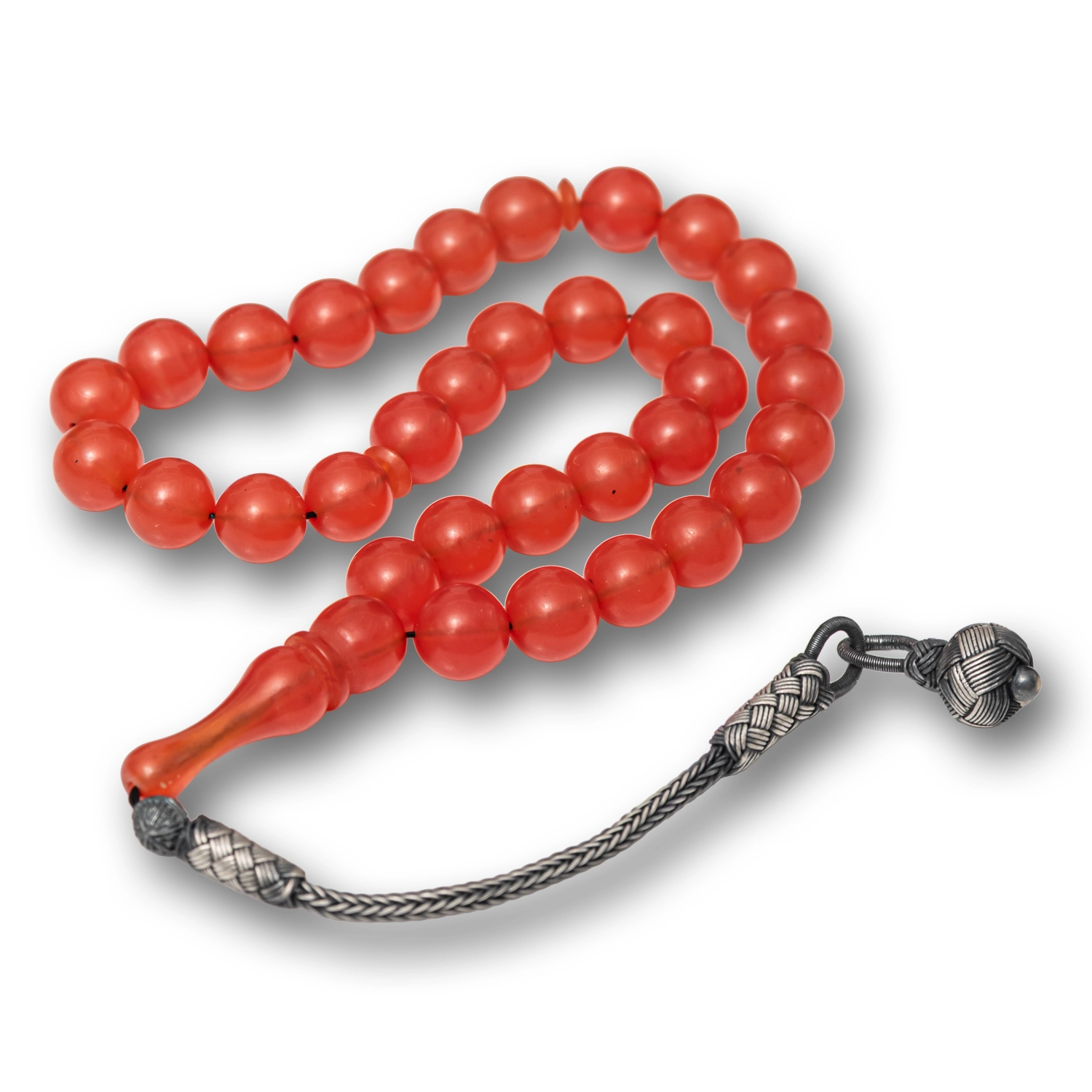 Gümüş top kazaz püsküllü, yuvarlak kesim tanelere sahip sıkma kehribar tesbih; zarif işçiligi, klasik görünümü ve kaliteli yapısıyla günlük kullanım ve koleksiyon için ideal bir aksesuardır.