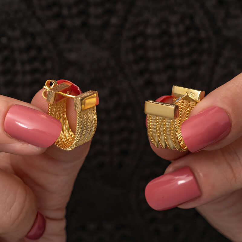 Modaya uyumlu şekilde tasarlanan gümüş trabzon hasır kadın küpe modellerini hem gündelik yaşantınızda hem özel gün ve gecelerinizde şık bir şekilde kullanabilirsiniz. Yenilikçi her yaştan kadının beğenisine hitap eden ürünlerle kombinlerinizi tamamlayabilirsiniz. Bu şık küpe; doğum günü hediyesi, sevgililer günü hediyesi veya özel günlerde tercih edilebilecek mükemmel bir seçenektir. Gümüş trabzon hasır çivili kadın küpe 925 ayar gümüşten imal edilmiştir. Bu küpe üzerinde gold kaplama vardır. Gold kaplama yapılan ürünler parlaklığını uzun süre muhafaza eder, oksitlenmesini geciktirir. Tüm gümüş kadın küpe modellerinde olduğu gibi gümüş trabzon hasır kadın küpe modeli de el emeği ile üretilmiştir. Gümüş ve değerli taşlar nedeniyle belirtilen ortalama ürün ağırlığında ± %10 sapma olabilmektedir.