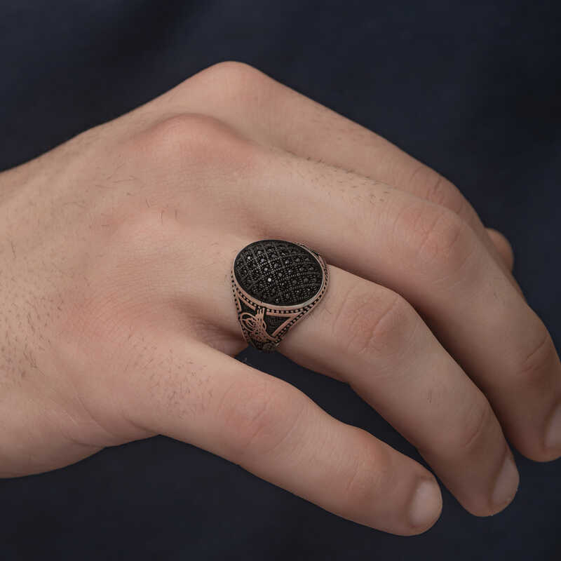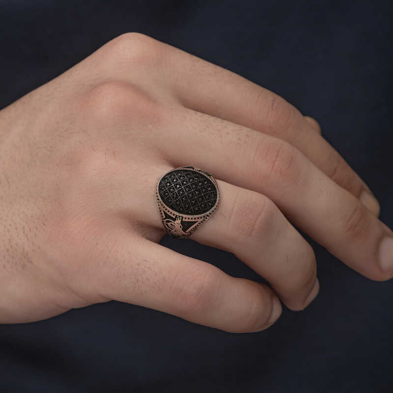 Gümüş Tuğralı Zirkon Siyah Taşlı Erkek Yüzük