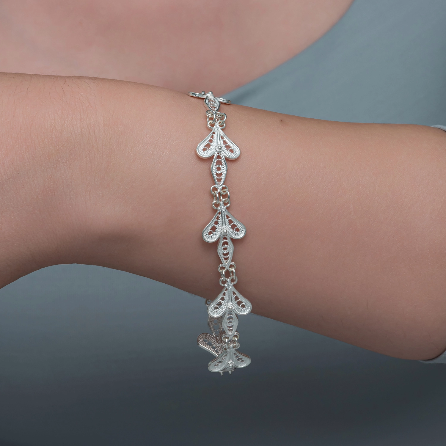Üç yapraklı telkari motifinin ince işçiliğiyle tasarlanan bu bileklik, zarafeti ve sade şıklığı bileğinizde buluşturur.