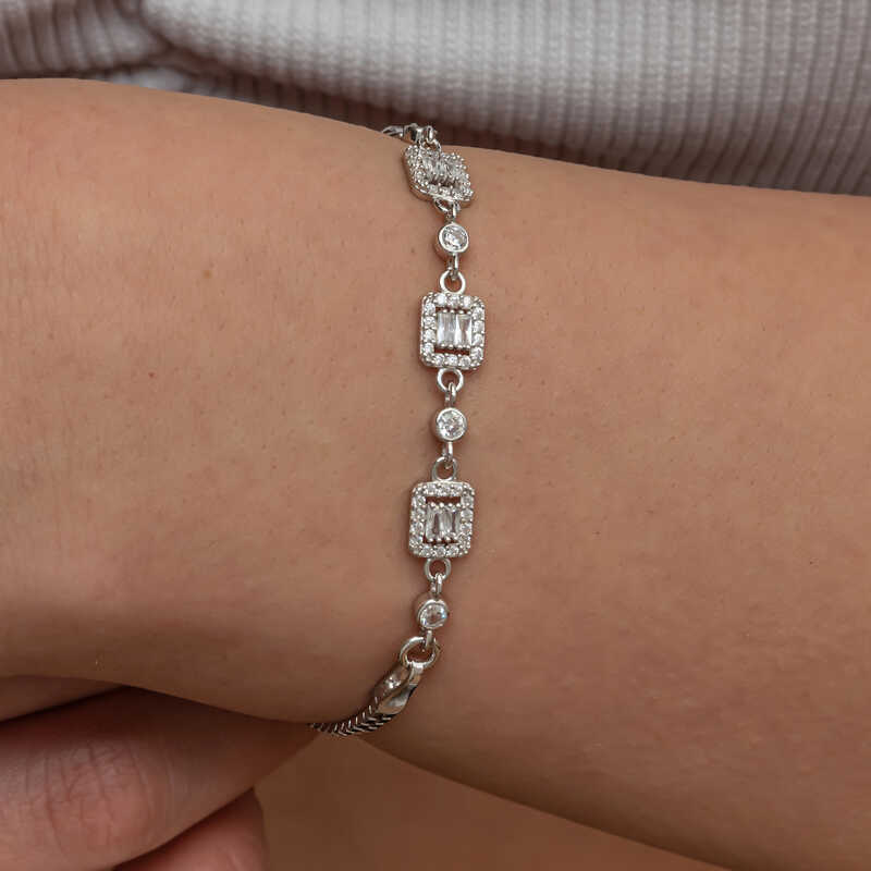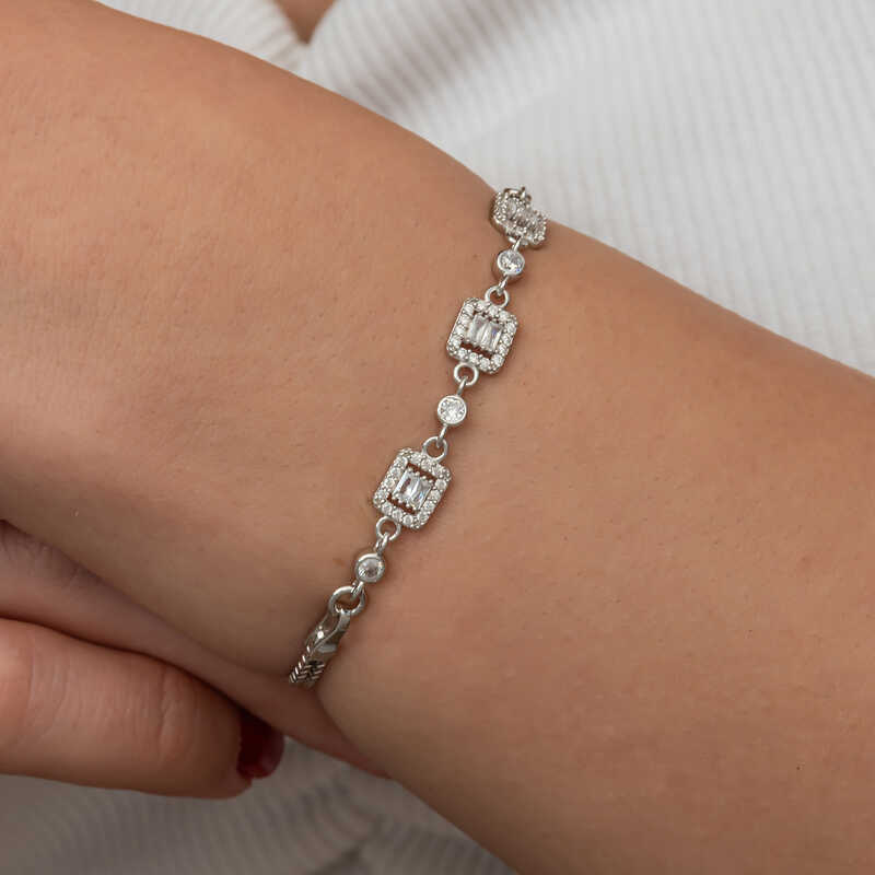 Üçlü baget taşlı kadın bileklik, şıklığı ve zarafeti bir araya getiren bir aksesuar türüdür.Bu bileklik, hem günlük kullanımda hem de özel günlerde rahatlıkla tercih edilebilecek bir aksesuardır. Farklı stillerle kombinlenebilir ve birçok kıyafetle uyum sağlar. Gümüş üzerine rodyum kaplama yapılmıştır. Rodyum kaplama yapılan zirkon taşlı kare kadın bileklik modelleri parlaklığını uzun süre muhafaza eder. Gümüş ve değerli taşlar nedeniyle belirtilen ortalama ürün ağırlığında ± %10 sapma olabilmektedir.