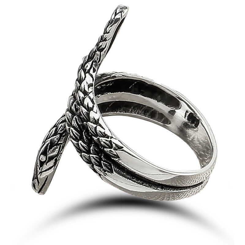 Mitolojide yılan figürü oldukça popüler bir kavram olarak karşımıza çıkmaktadır. Birçok kültür yılana farklı anlamlar vermektedir. Yaşam süreci ve yaşamını sürdürdüğü elverişsiz koşullar, yer altından yeryüzüne açılan deliklerden yüzeye çıkması, vücut dış yüzeyinden kansız bir şekilde sıyrılarak kendini yenilemesi nedeniyle insanlar tarafından sıklıkla ölüm ve yeniden doğuşun sırrına sahip bir hayvan olarak algılanmasına neden olmuştur. Zaman zaman da aynı nedenden ötürü tıp ile ilişkilendirilmiştir. Ayrıca yılanın besini bütün olarak yutması ve karnında uzun süre saklaması "ana karnına dönüş" ile özdeşleştirilmiş ve bu nedenle yılan pek çok mitolojide ölümü takiben yeniden doğuşu sembolize eder olmuş ve "yaratıcı" görevi üstlenmiştir. Siz de farklı kültürlerde farklı anlamlar taşıyan gümüş yılan yüzüğü sevdiklerinize armağan edebilir ya da kendinizi ödüllendirebilirsiniz. Bu şık yüzük; doğum günü hediyesi, sevgililer günü veya özel günlerde tercih edilebilecek mükemmel bir seçenektir. Yüzük; 925 ayar gümüşten imal edilmiştir. Gümüş üzerine oksit kaplama yapılmıştır. Diğer yüzüklerde olduğu gibi gümüş yılan yüzük de el emeği ile üretilmiştir. Gümüş ve değerli taşlar nedeniyle belirtilen ortalama ürün ağırlığında ± %10 sapma olabilmektedir.
