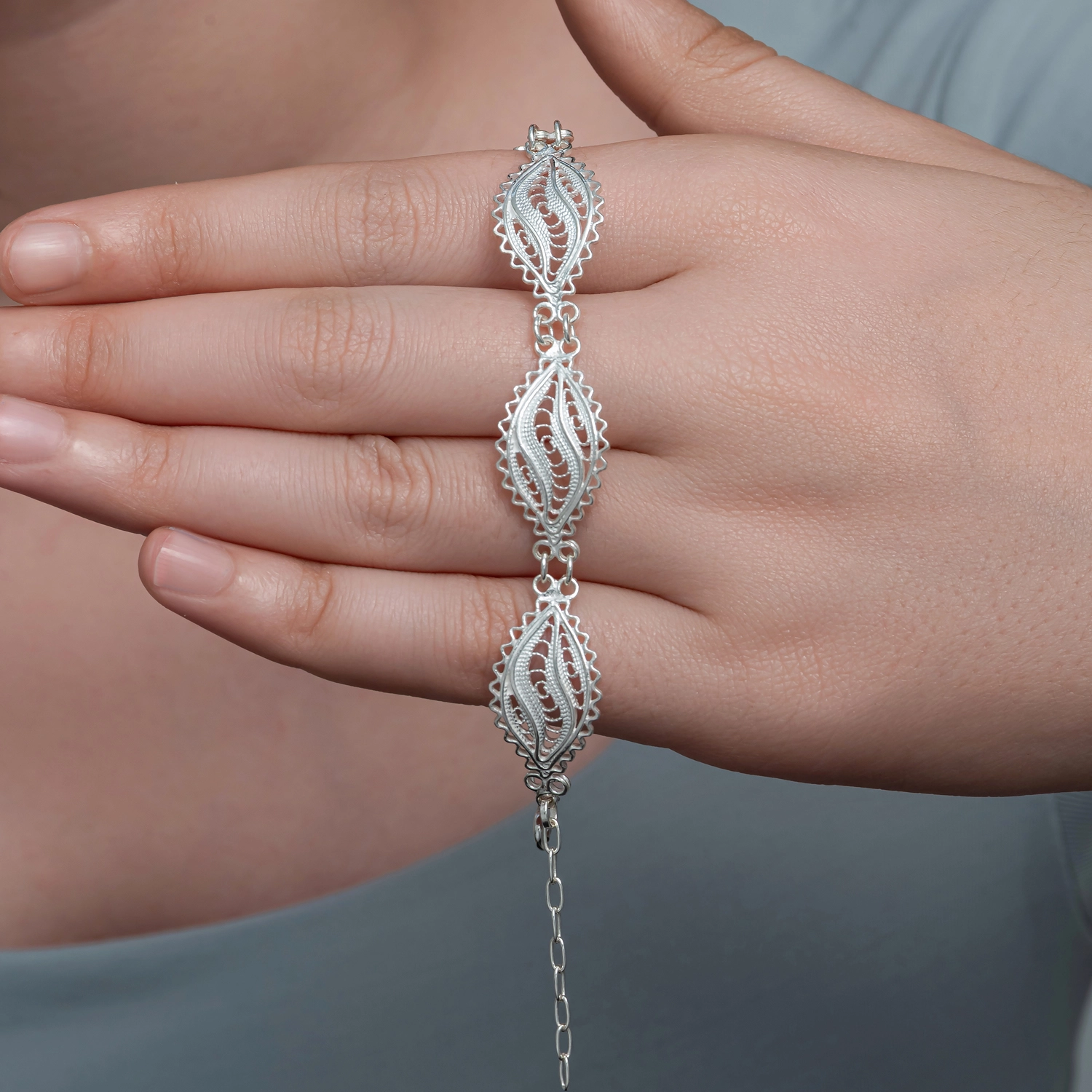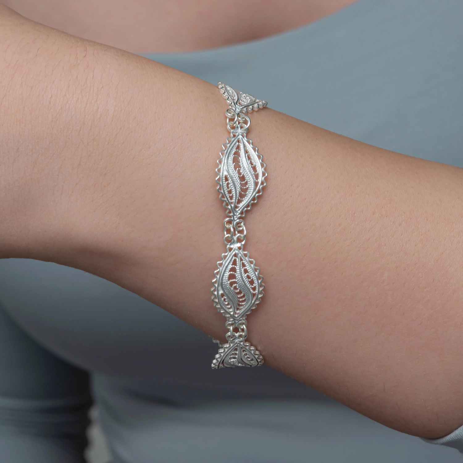 İnce telkari işçiliğiyle tasarlanmış yaprak motifli, 925 ayar gümüşten üretilen zarif ve şık kadın bilekliği.