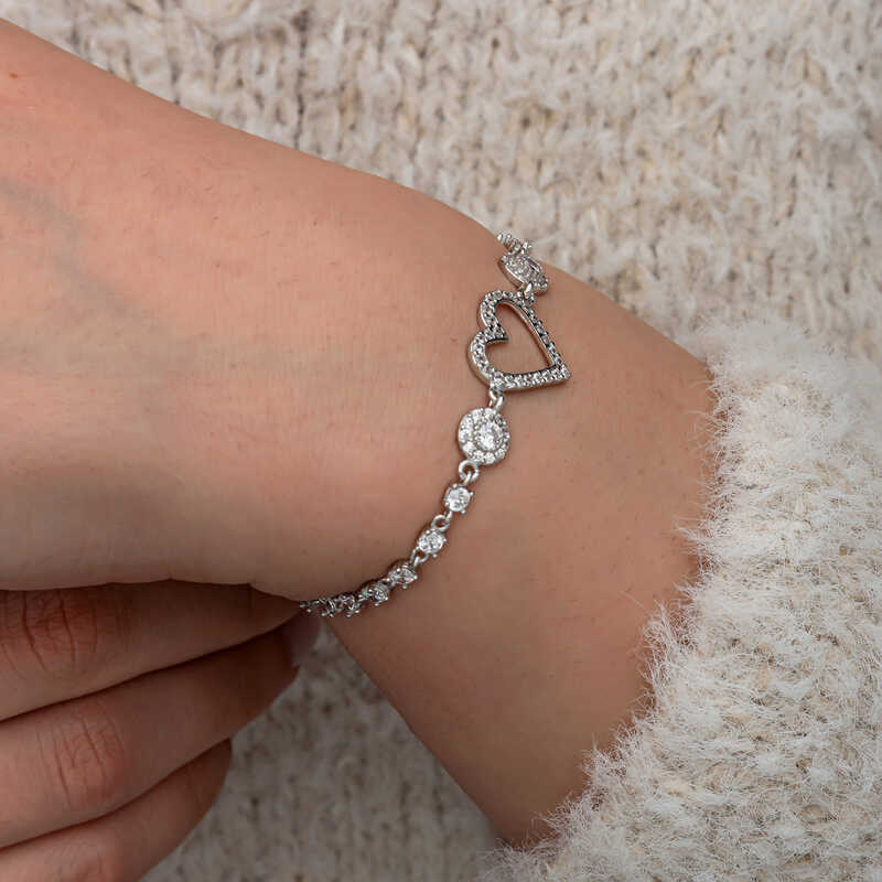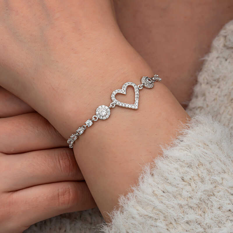 Gümüş Zirkon Taşlı Kalpli Kadın Bileklik