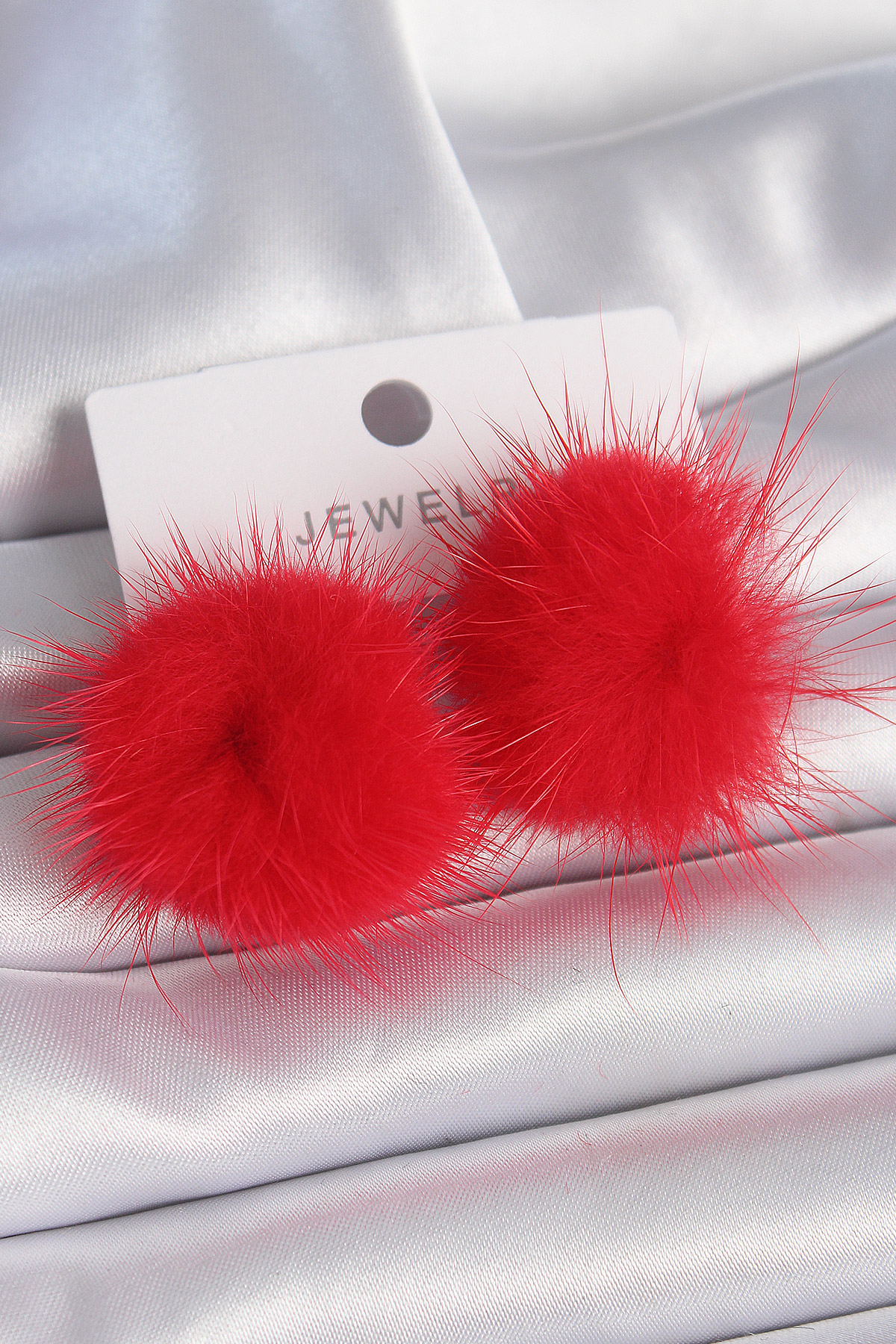 Kırmızı Tüylü Ponpon Model Kadın Küpe