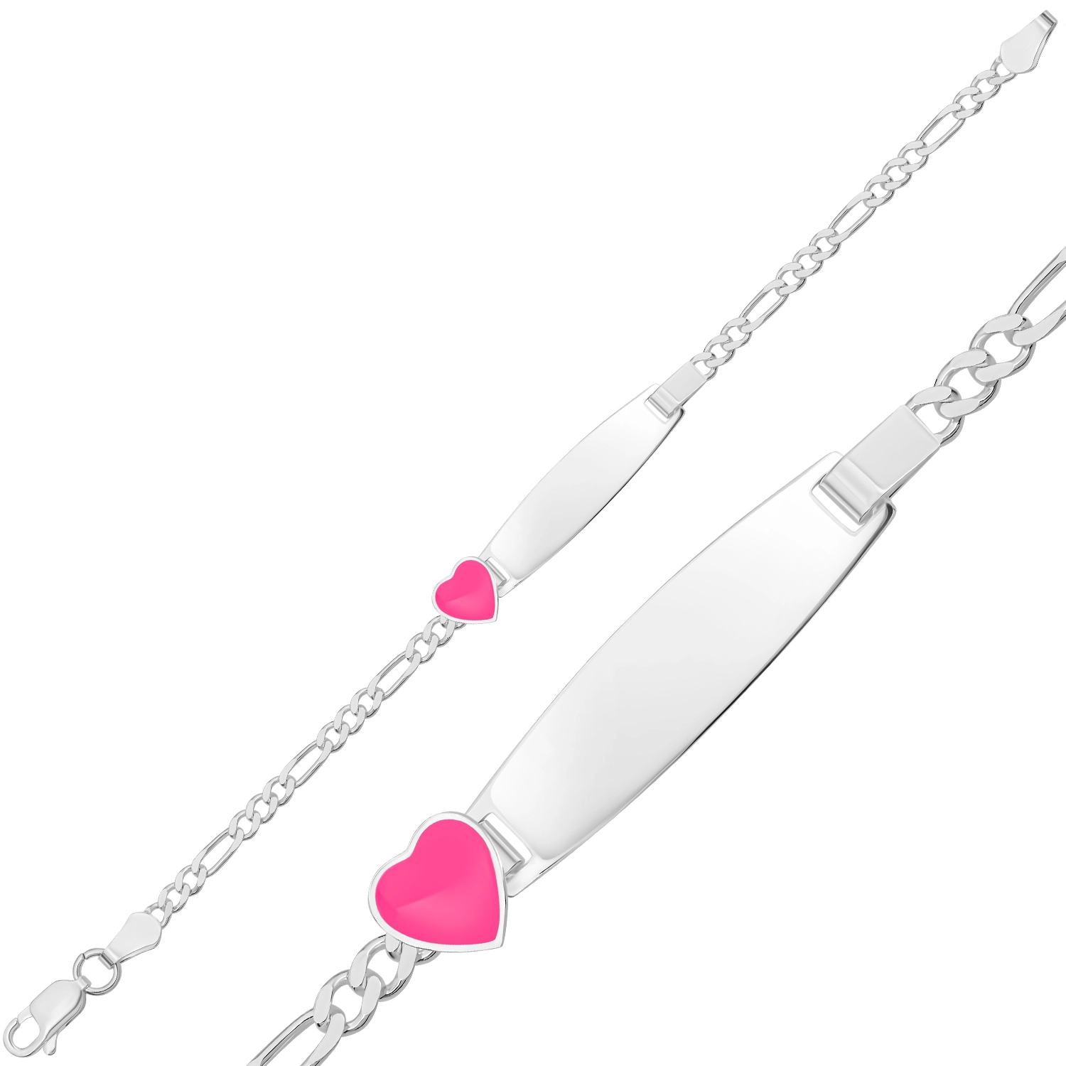 Pembe kalp figürlü, 925 ayar gümüşten üretilen ve çocuğunuza özel isimle kişiselleştirilebilen zarif çocuk künyesi.