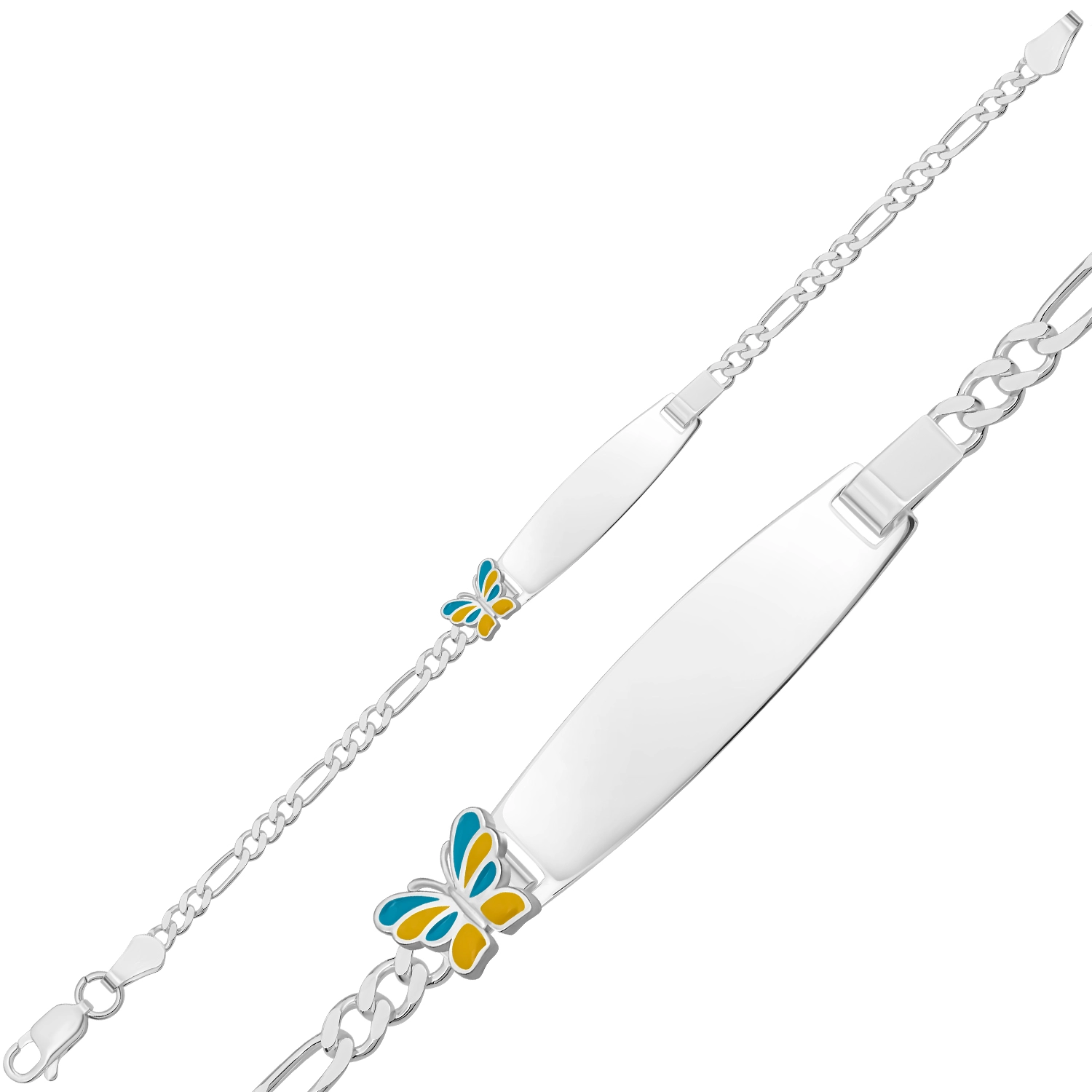 Sarı ve mavi kelebek figürüyle süslenmiş, %925 ayar gümüşten üretilen, isim yazılabilen şık ve sevimli çocuk künyesi.