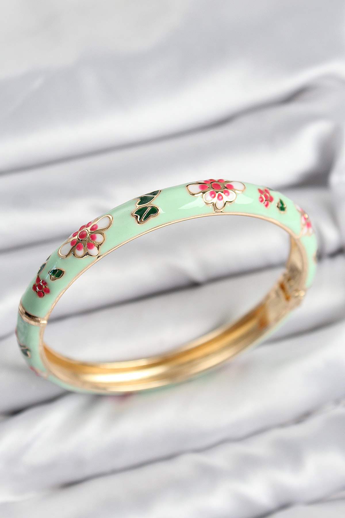 Mineli Pirinç Su Yeşili Çiçek Motifli Gold Kadın Kelepçe