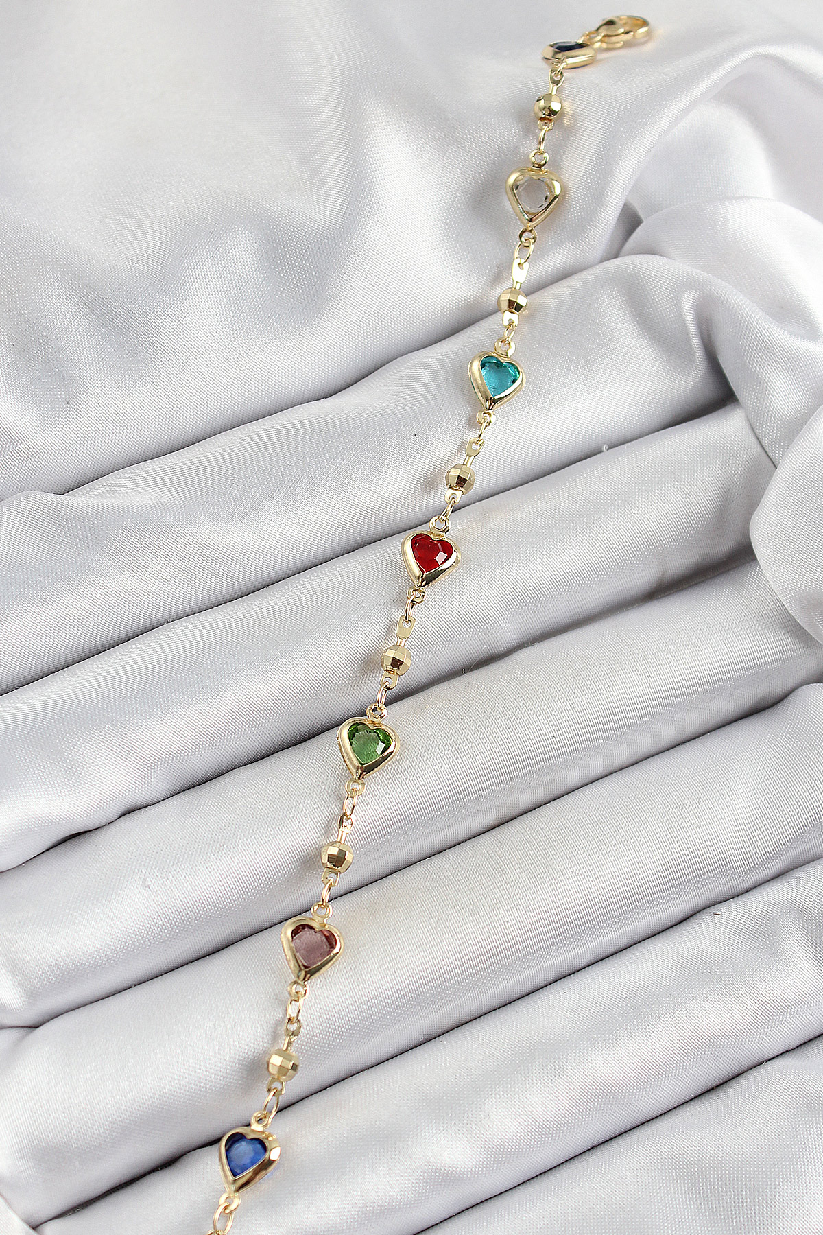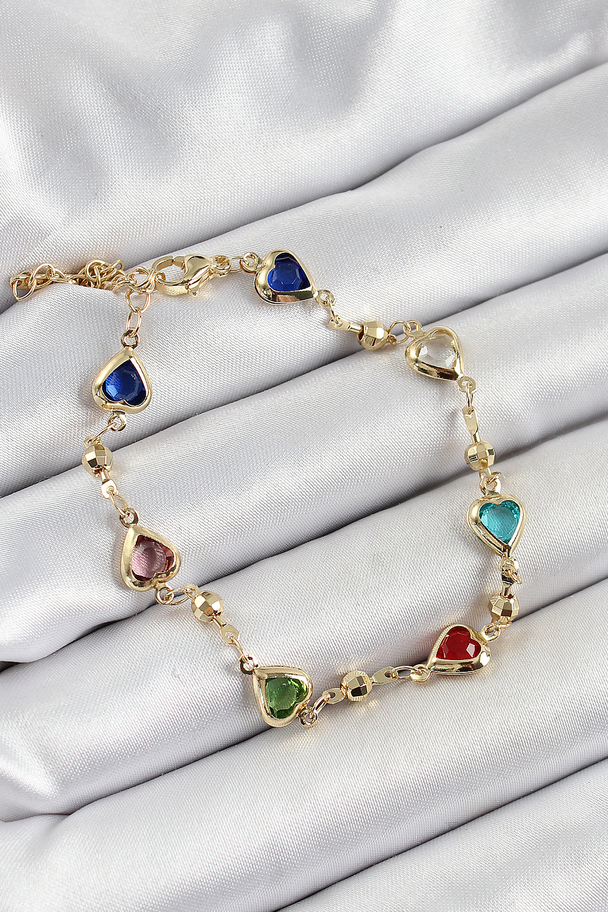 Pirinç Asorti Kalp Model Gold Renk Zirkon Taşlı Kadın Bileklik