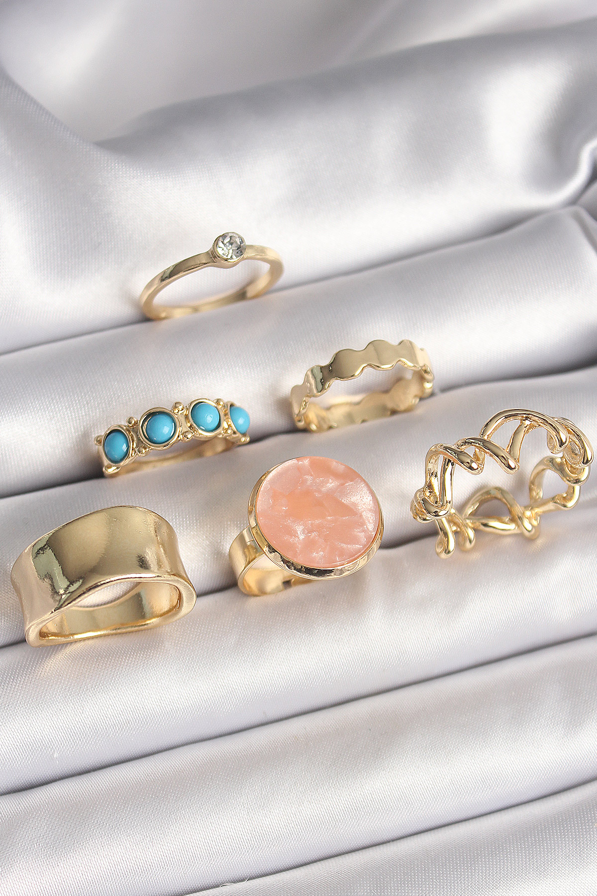 Pirinç Gold Renk Daire Pembe Mineli Zirkon Taş Detaylı 6’Lı Kadın Yüzük Seti