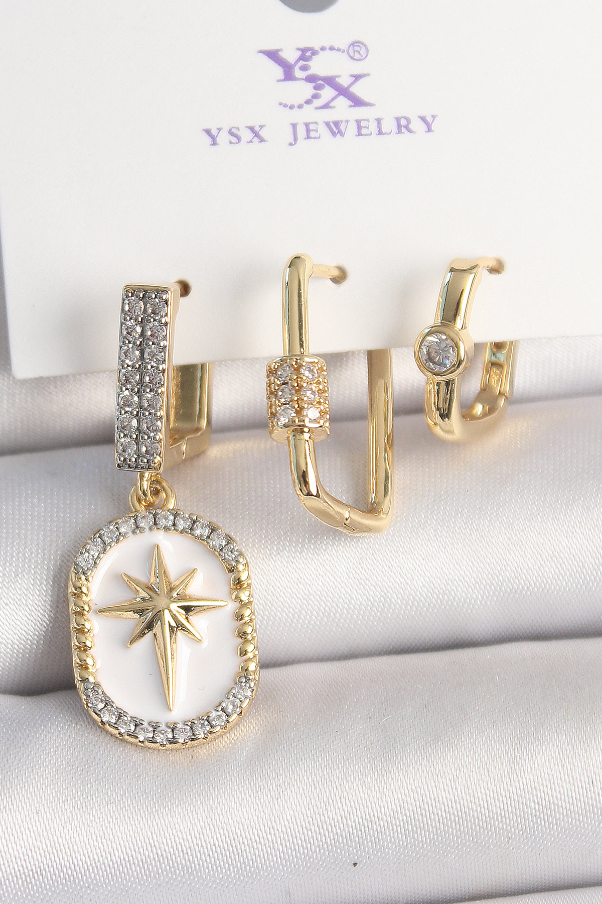 Pirinç Gold Renk Sallantı Zirkon Taş İşlmeli Yıldız Portre Model 3’Lü Kadın Kombin Küpe