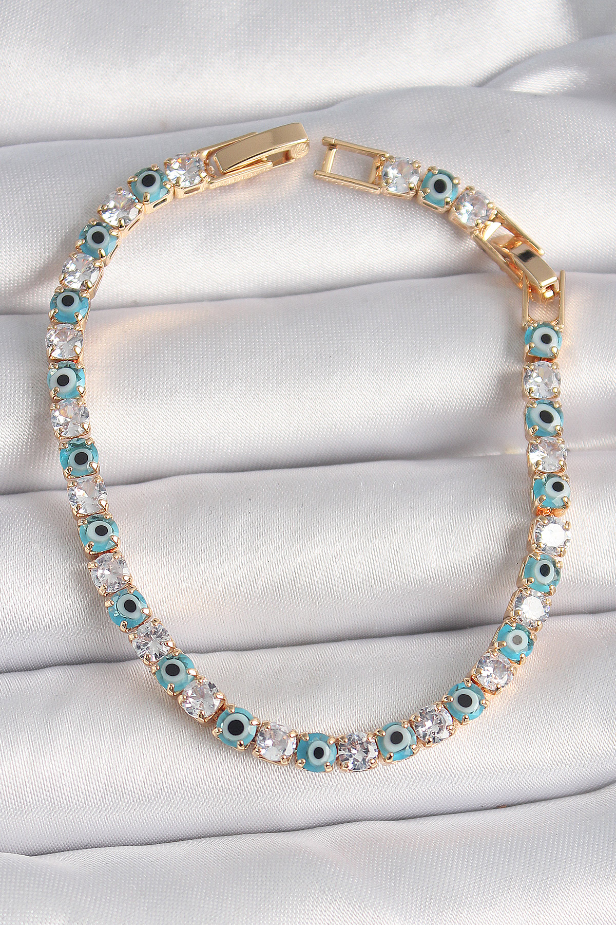 İlk yorum yapan sen ol “Pirinç Gold Renk Su Yolu Zirkon Taşlı Nazar Boncuklu Kadın Bileklik”