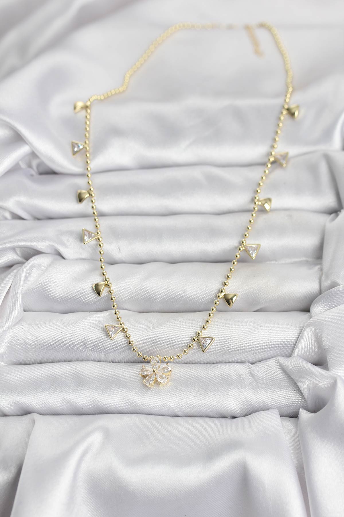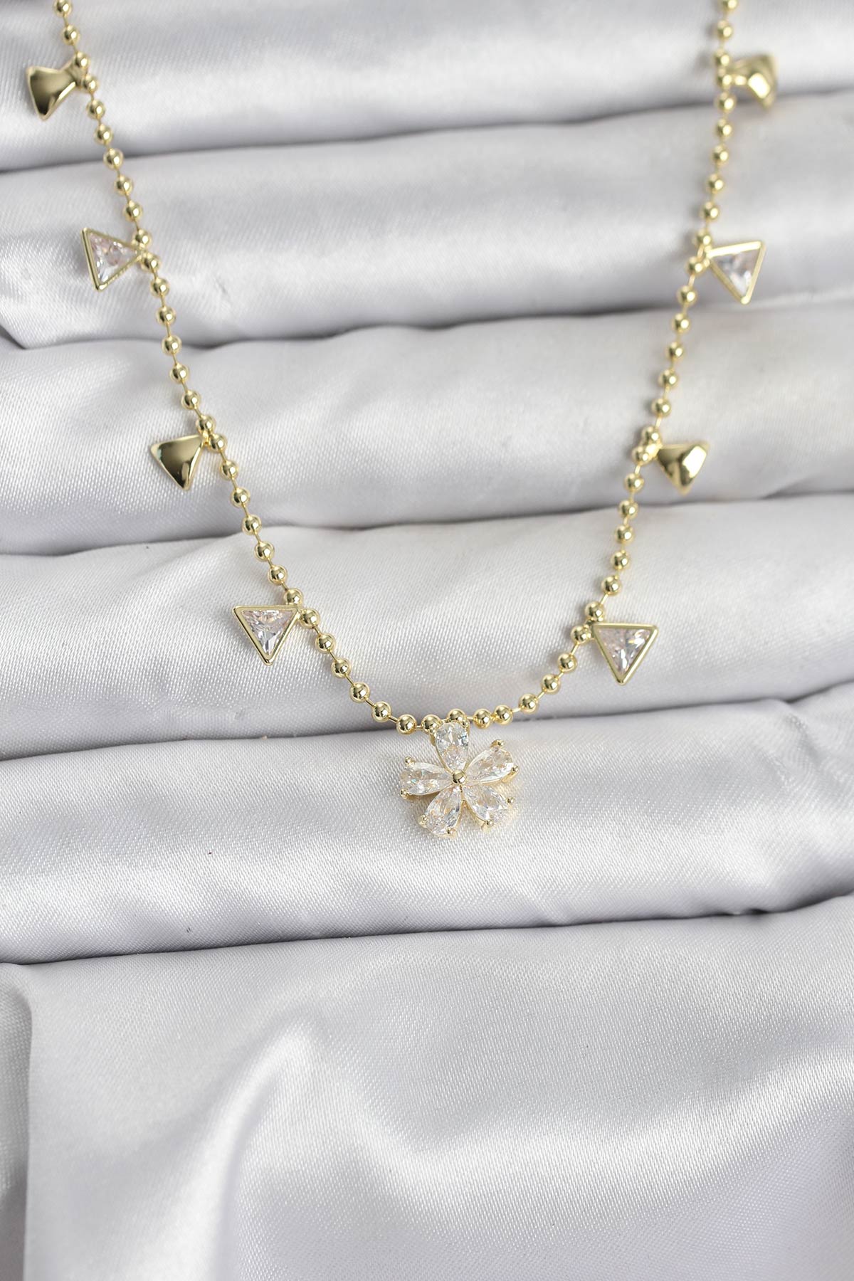 Pirinç Gold Renk Zirkon Taşlı Çiçek Model Kadın Kolye