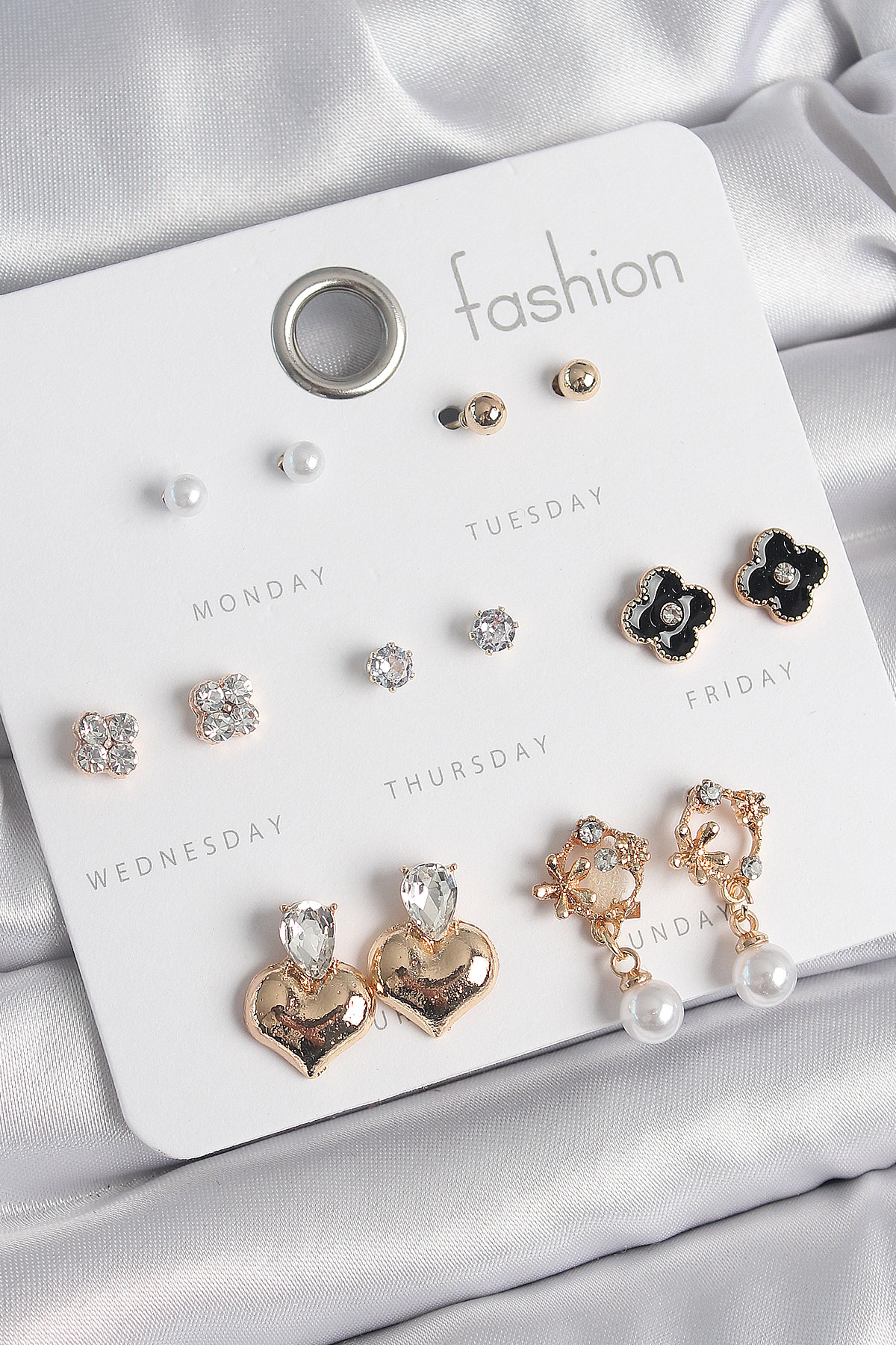Pirinç Gold Renk Zirkon Taşlı Kalp Figür Siyah Yonca Detay 7 Çift Kadın Küpe Seti