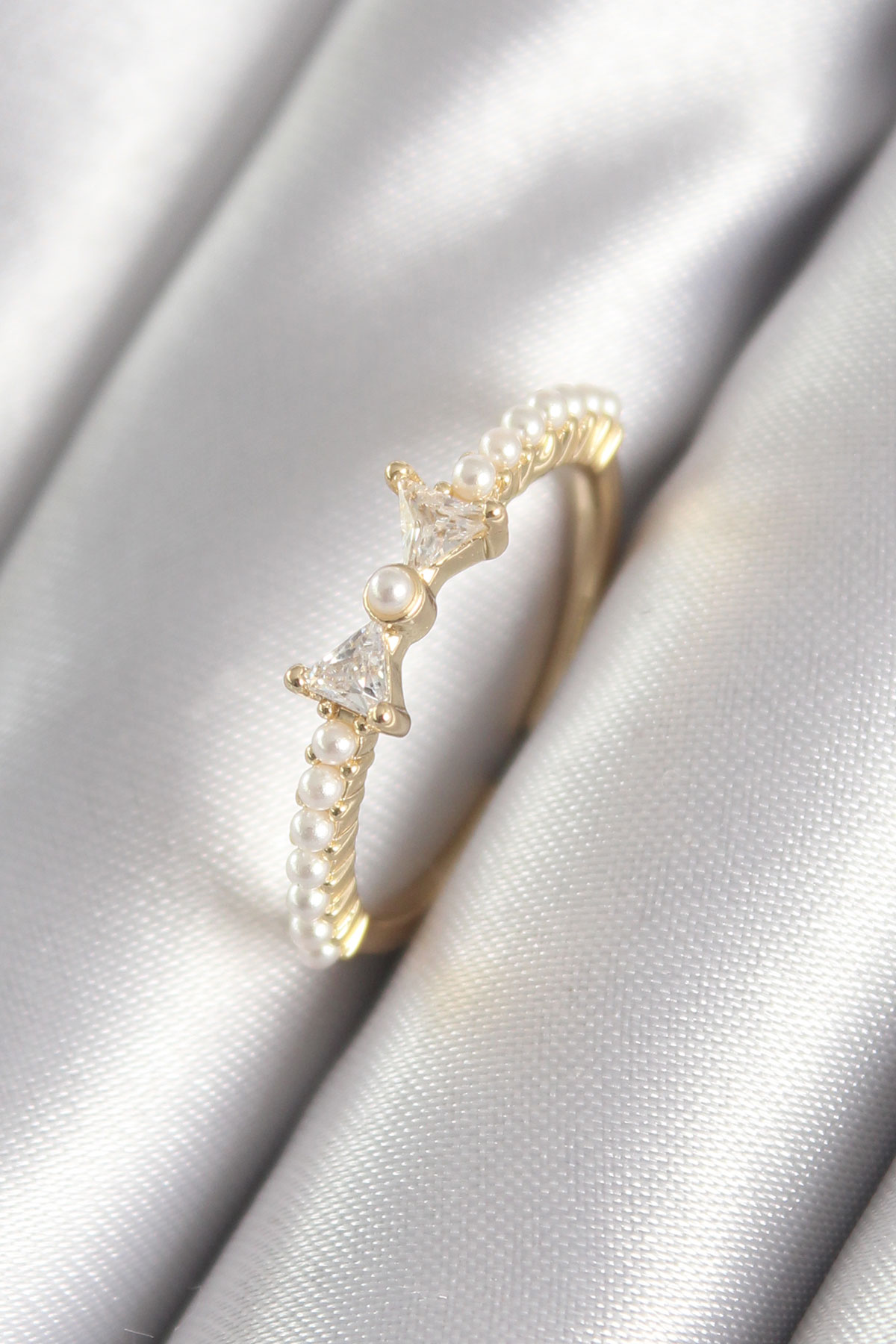 Pirinç Gold Renk Zirkon Taşlı Kurdele İnci Detay Kadın Yüzük