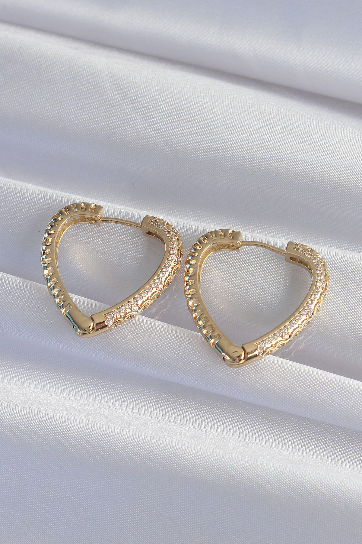 Pirinç Gold Renk Zirkon Taşlı Motifli Kalp Küpe
