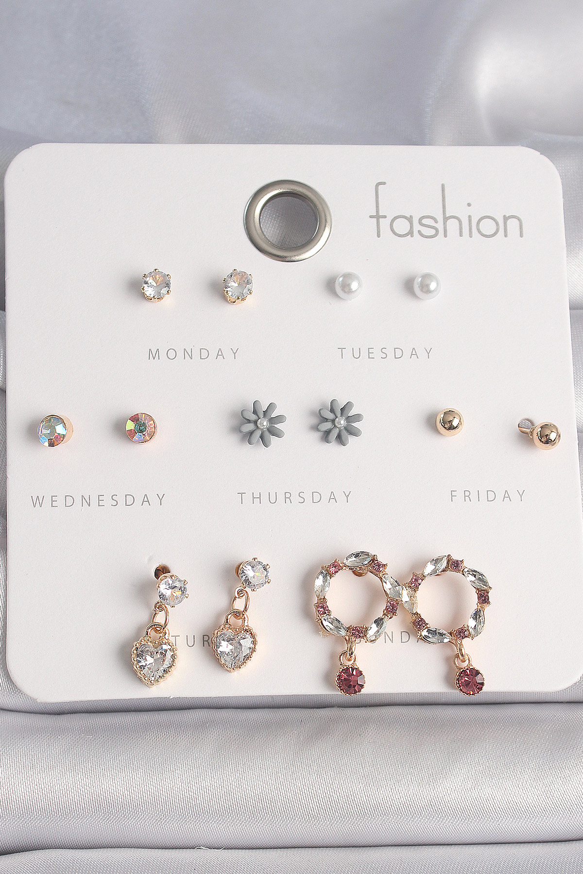 Pirinç Gold Renk Zirkon Taşlı Sallantı Kalp Çiçek Figür 7 Çift Kadın Küpe Seti