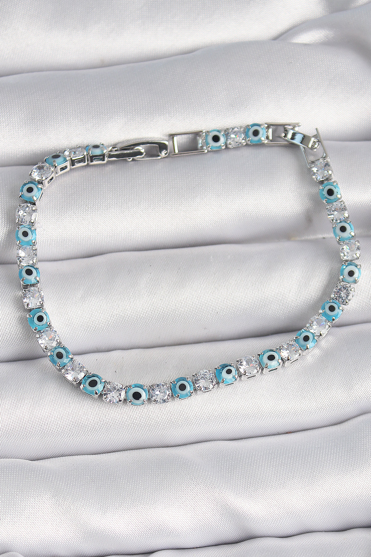 Pirinç Gümüş Renk Su Yolu Zirkon Taşlı Nazar Boncuklu Kadın Bileklik