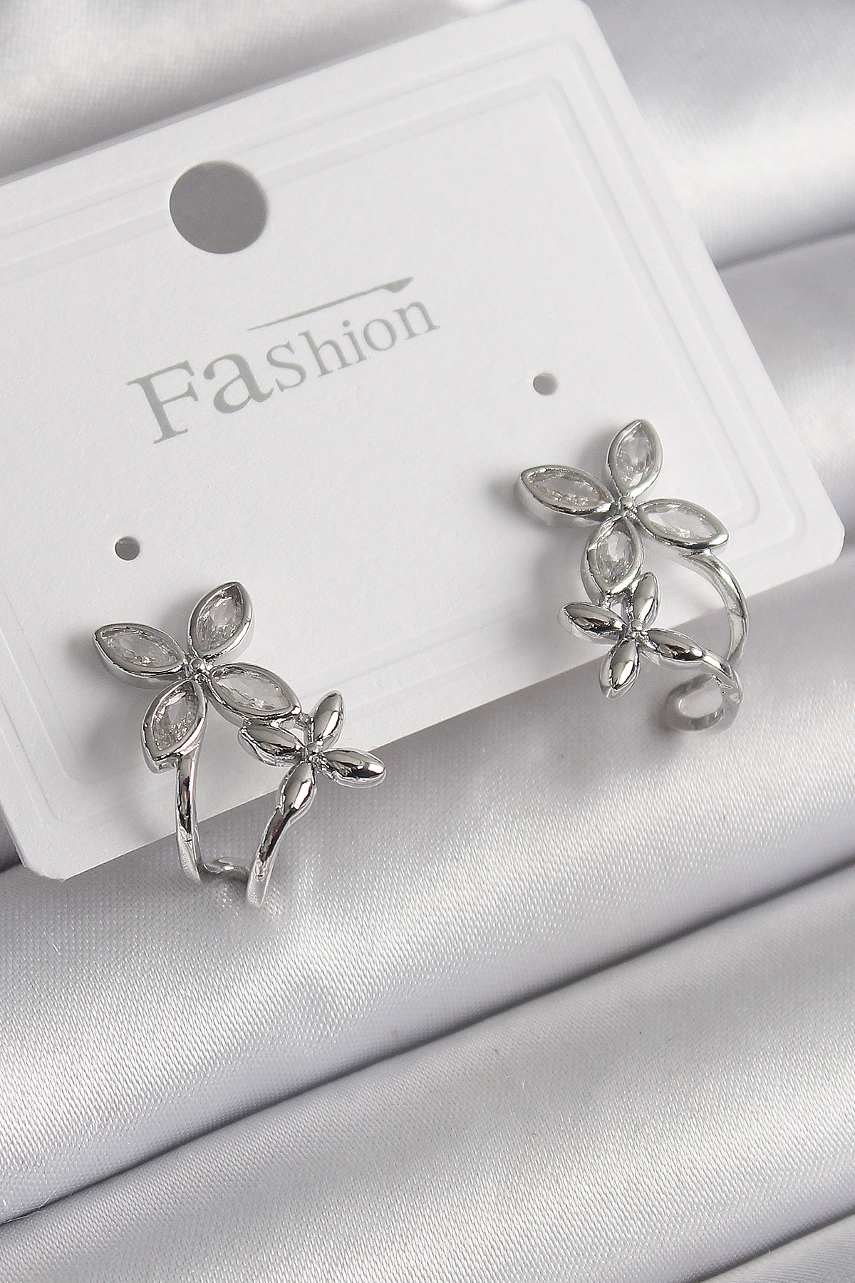 Pirinç Gümüş Renk Zirkon Taşlı 2’Li Çiçek Model Kadın Küpe
