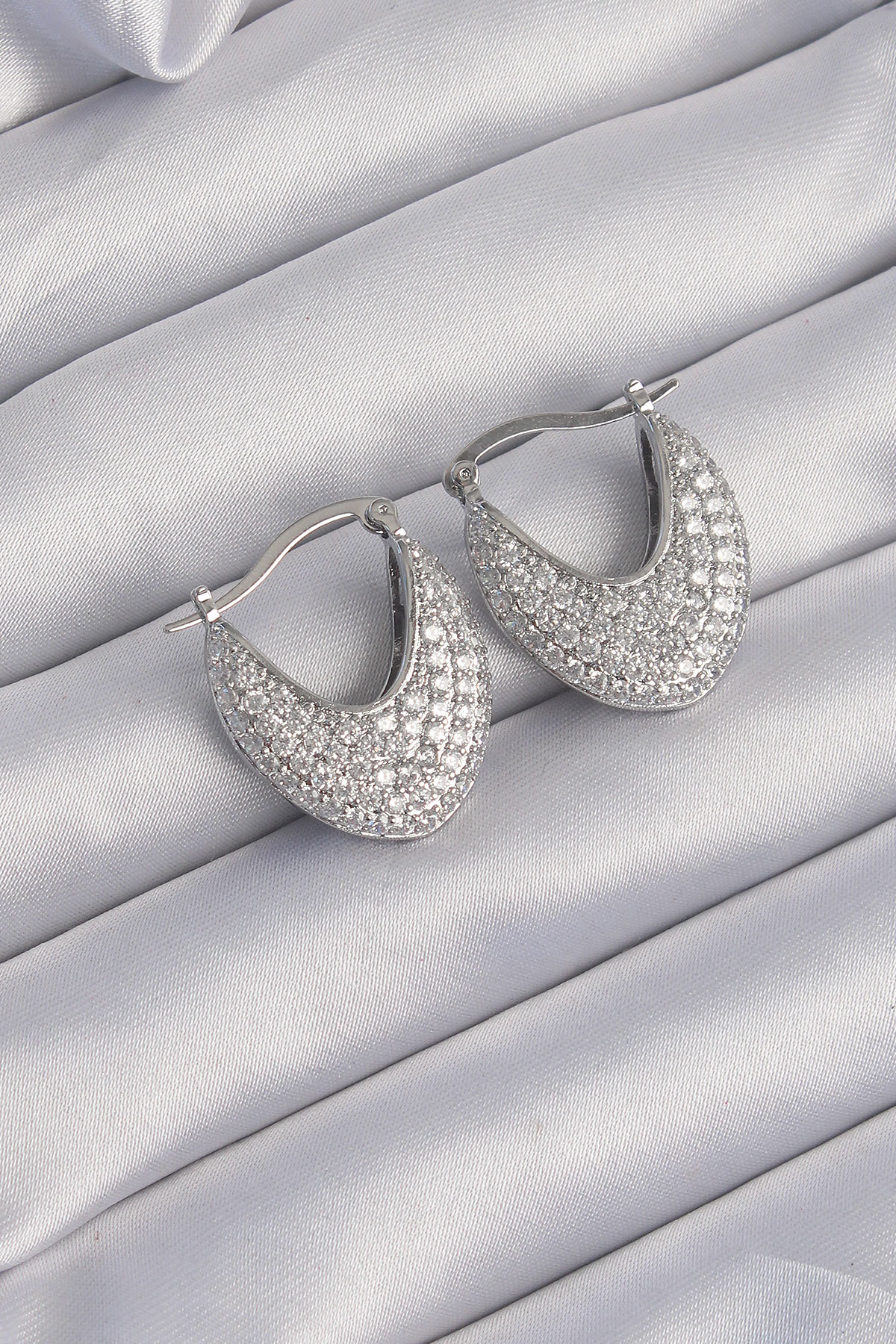 Pirinç Gümüş Renk Zirkon Taşlı Badem Model Küpe