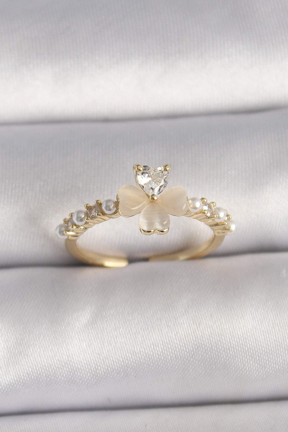 Pirinç Gümüş Renk Zirkon Taşlı Beyaz Mineli Yonca Model İnci Detay Ayarlanabilir Yüzük