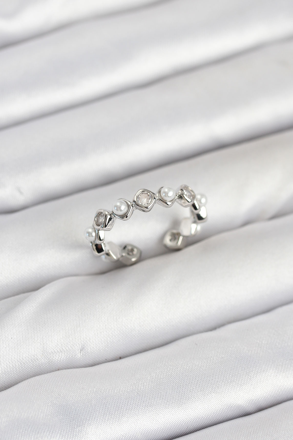 Pirinç Gümüş Renk Zirkon Taşlı İncili Kadın Yüzük