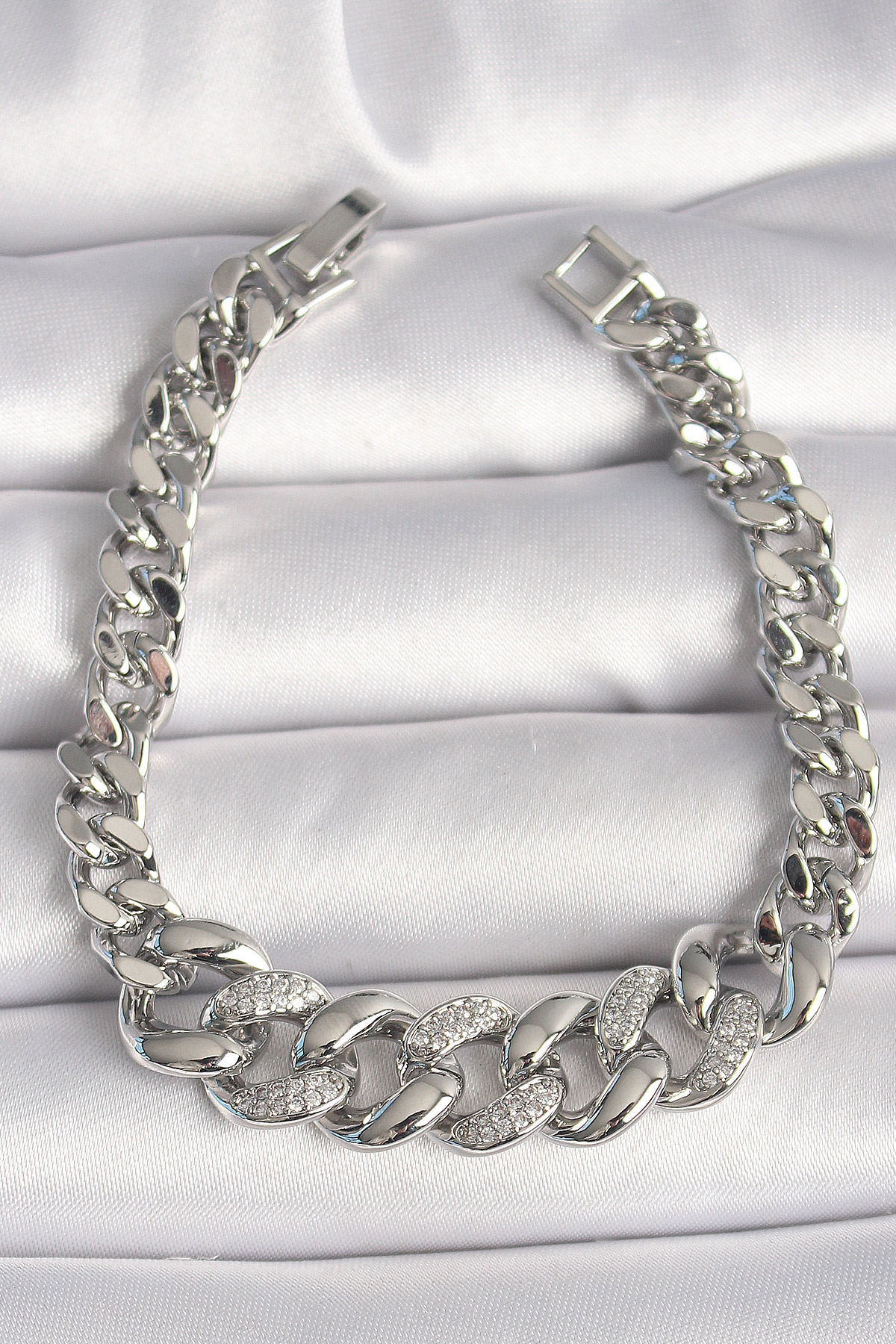 Pirinç Gümüş Renk Zirkon Taşlı Kalın Halka Model Kadın Bileklik