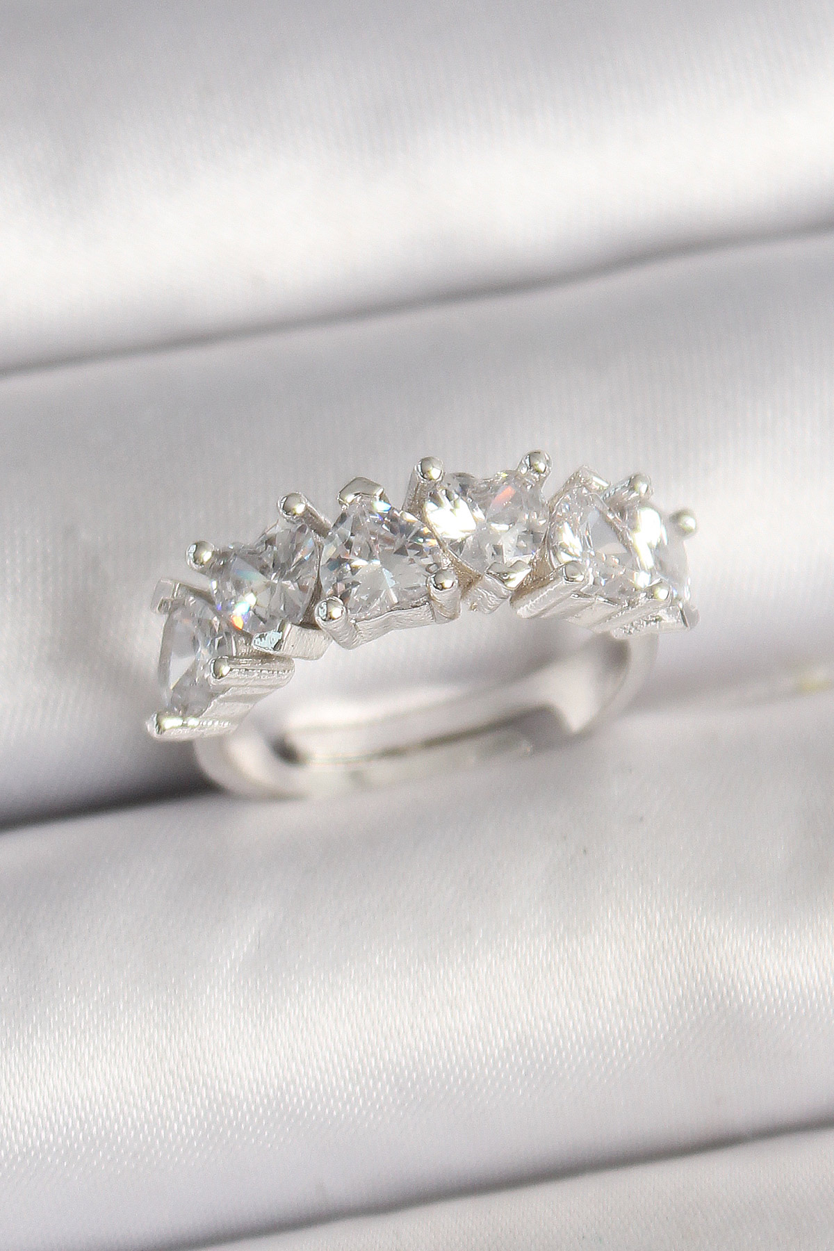 Pirinç Gümüş Renk Zirkon Taşlı Kalp Model Ayarlanabilir Kadın Yüzük