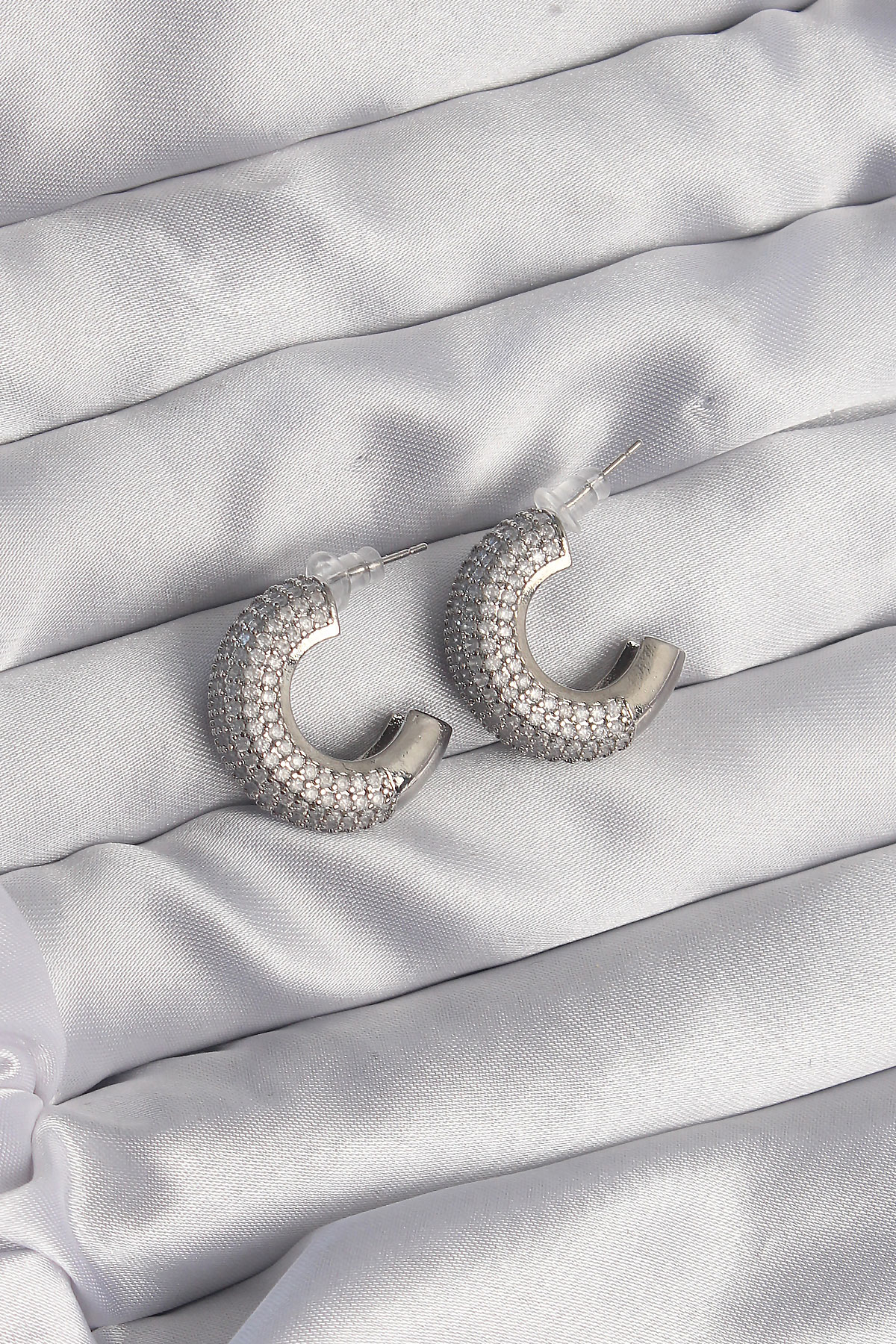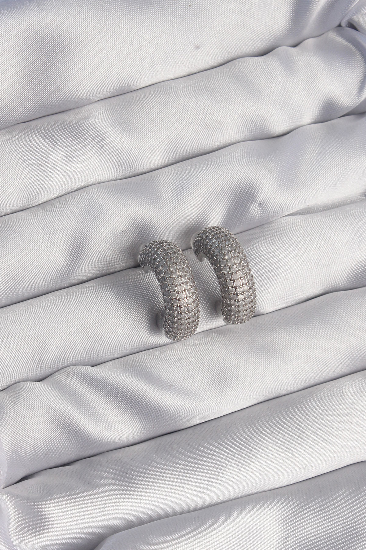 Pirinç Gümüş Renk Zirkon Taşlı Yarım Halka Küpe