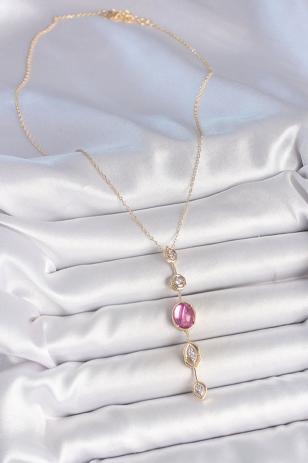 Pirinç Zincir Gold Renk Pembe Zirkon Taşlı Y Kolye