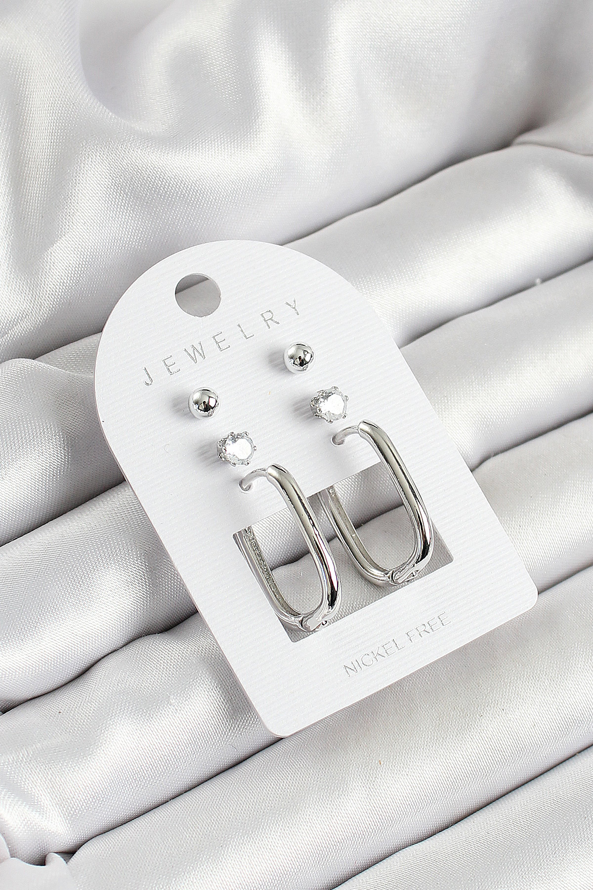 Pirinç Zirkon Taş Ve Dikdörtgen Figürlü Gümüş Renk 3’lü Çift Kadın Küpe Set