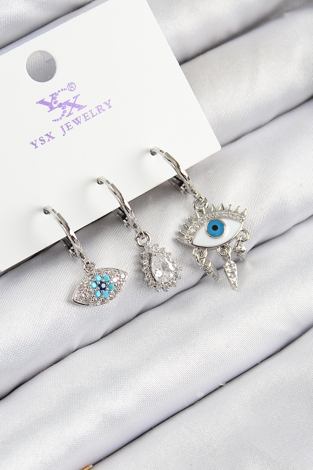 Pirinç Zirkon Taşlı 3’lü Fatma’nın Gözü Model Gümüş Renk Kadın Küpe