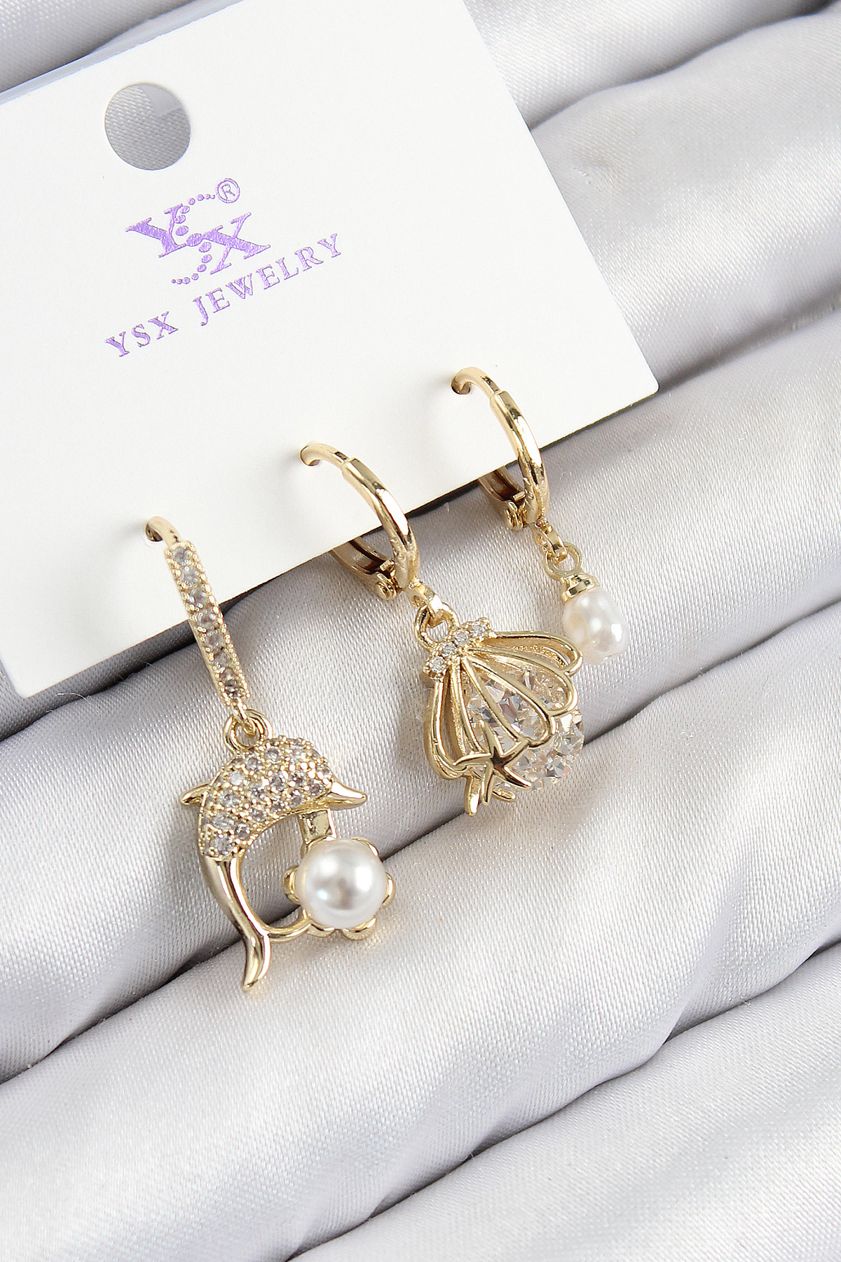Pirinç Zirkon Taşlı 3’lü Yunus Balığı Ve İstiridye Model Gold Renk Kadın Küpe