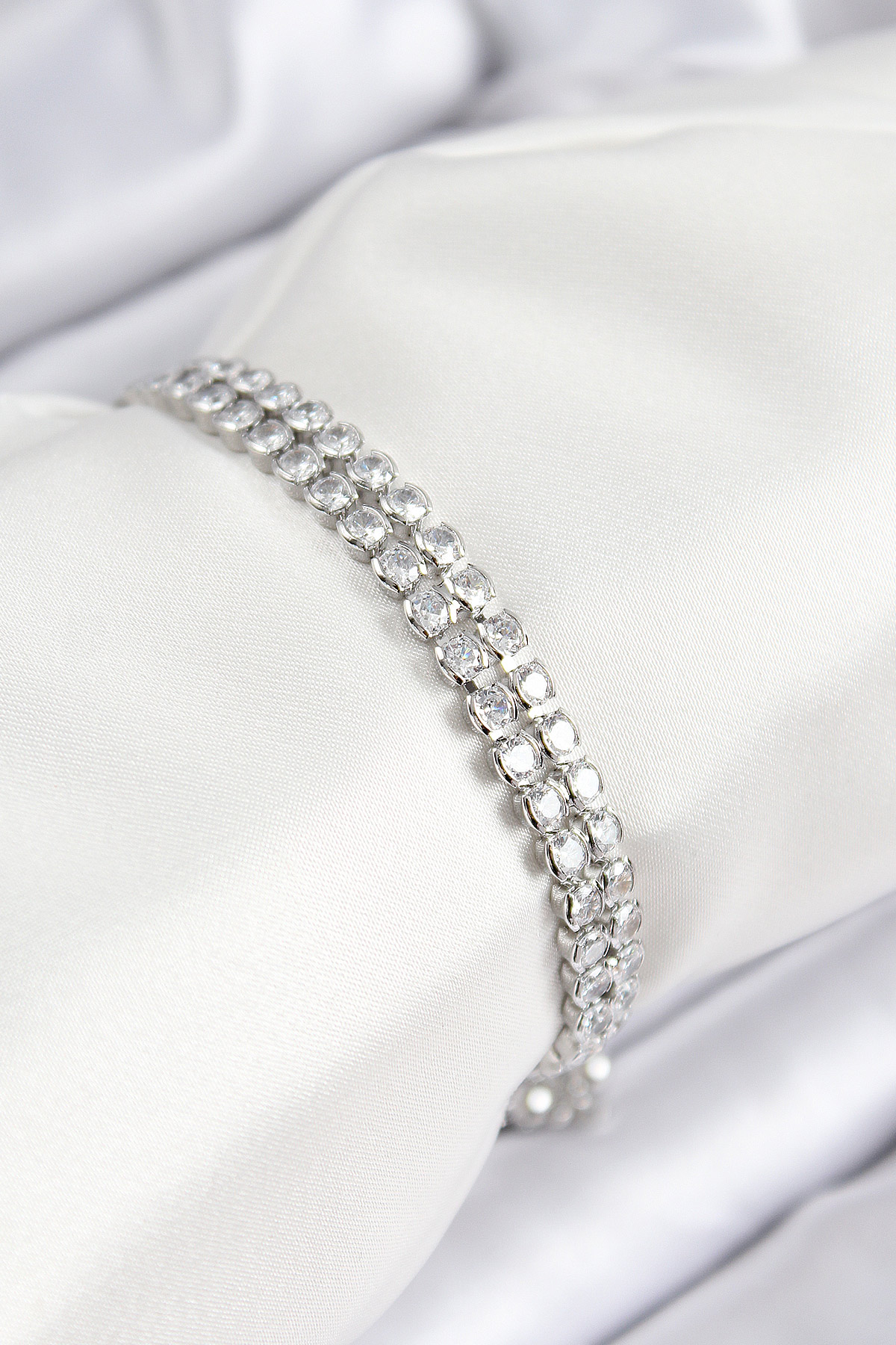 Pirinç Zirkon Taşlı Çift Sıra Model Gümüş Renk Asansörlü Kadın Bileklik