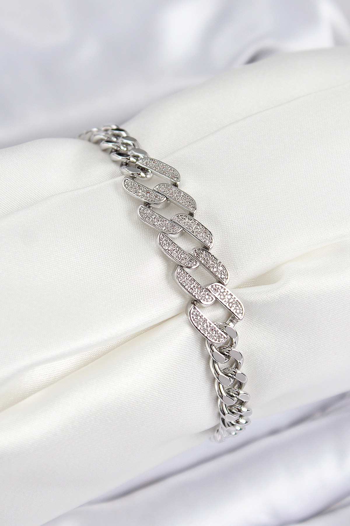 Pirinç Zirkon Taşlı Ezme Küba Zincir Model Gümüş Renk Kadın Bileklik
