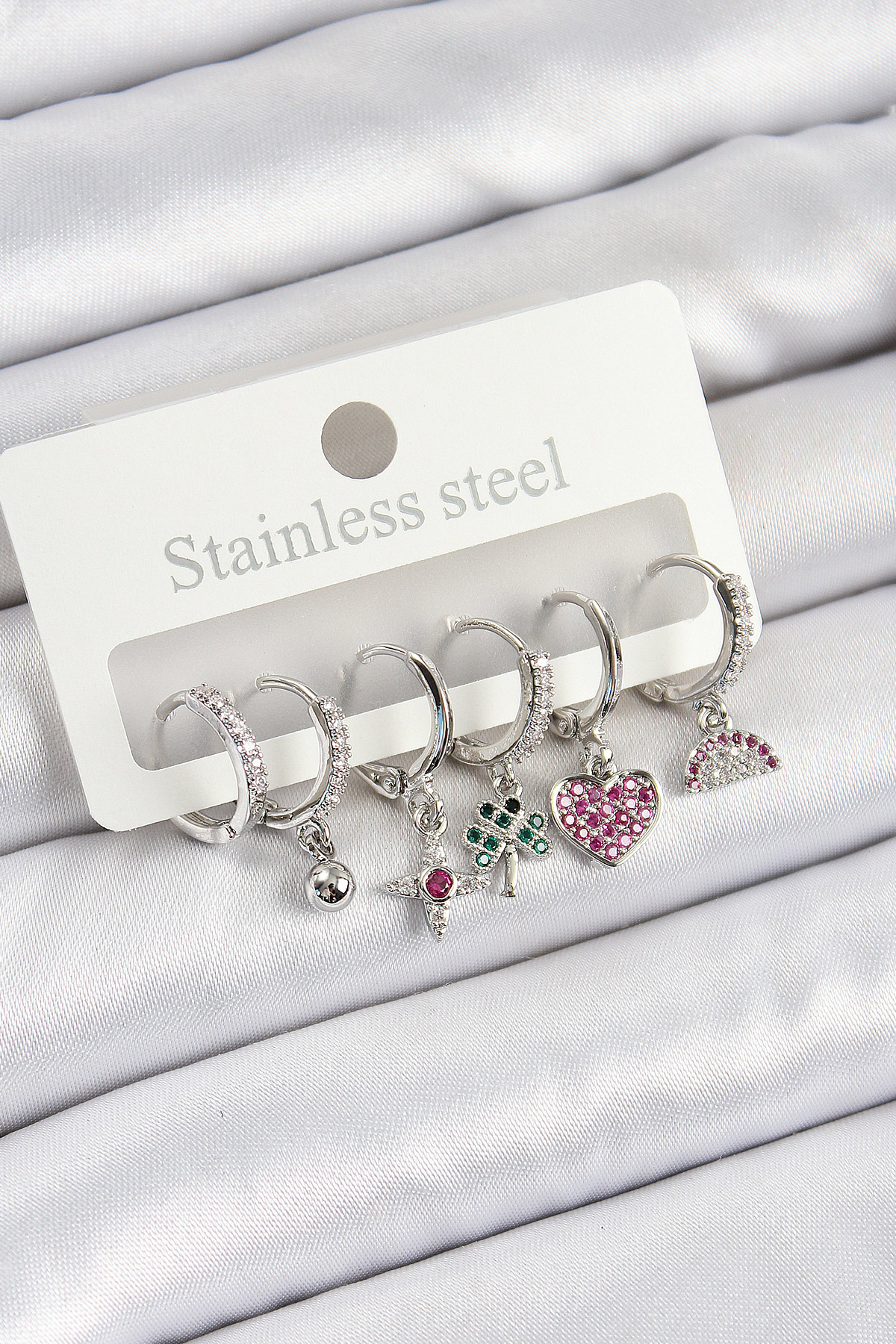 Pirinç Zirkon Taşlı Karpuz Yonca Kalp Pusula Karışık Model Gümüş Renk 6'lı Set Kadın Küpe