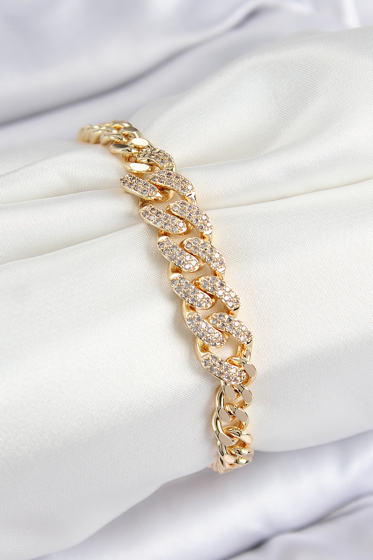 Pirinç Zirkon Taşlı Küba Zincir Model Gold Renk Kadın Bileklik