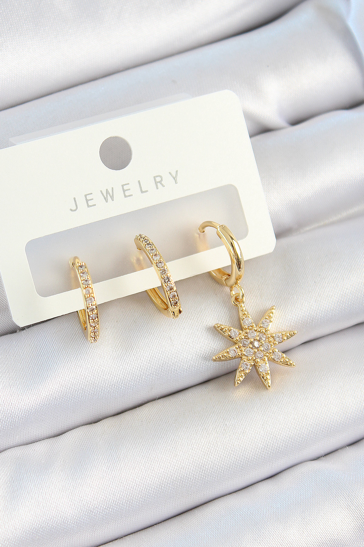 Pirinç Zirkon Taşlı Kutup Yıldızı Model Gold Renk 3’lü Çift Kadın Küpe Set