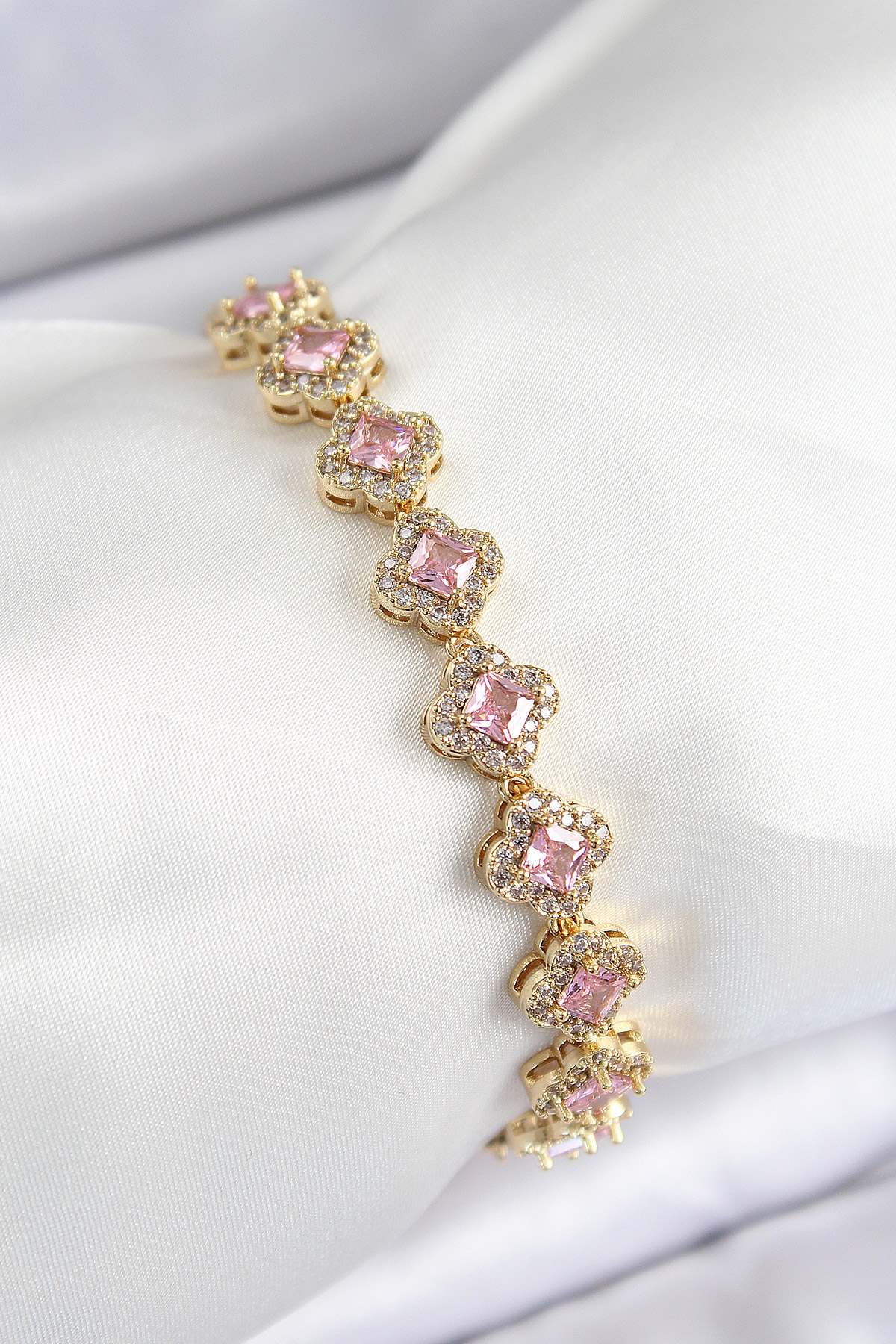 Pirinç Zirkon Taşlı Pembe Yonca Baget Model Gold Renk VIP Seri Kadın Bileklik