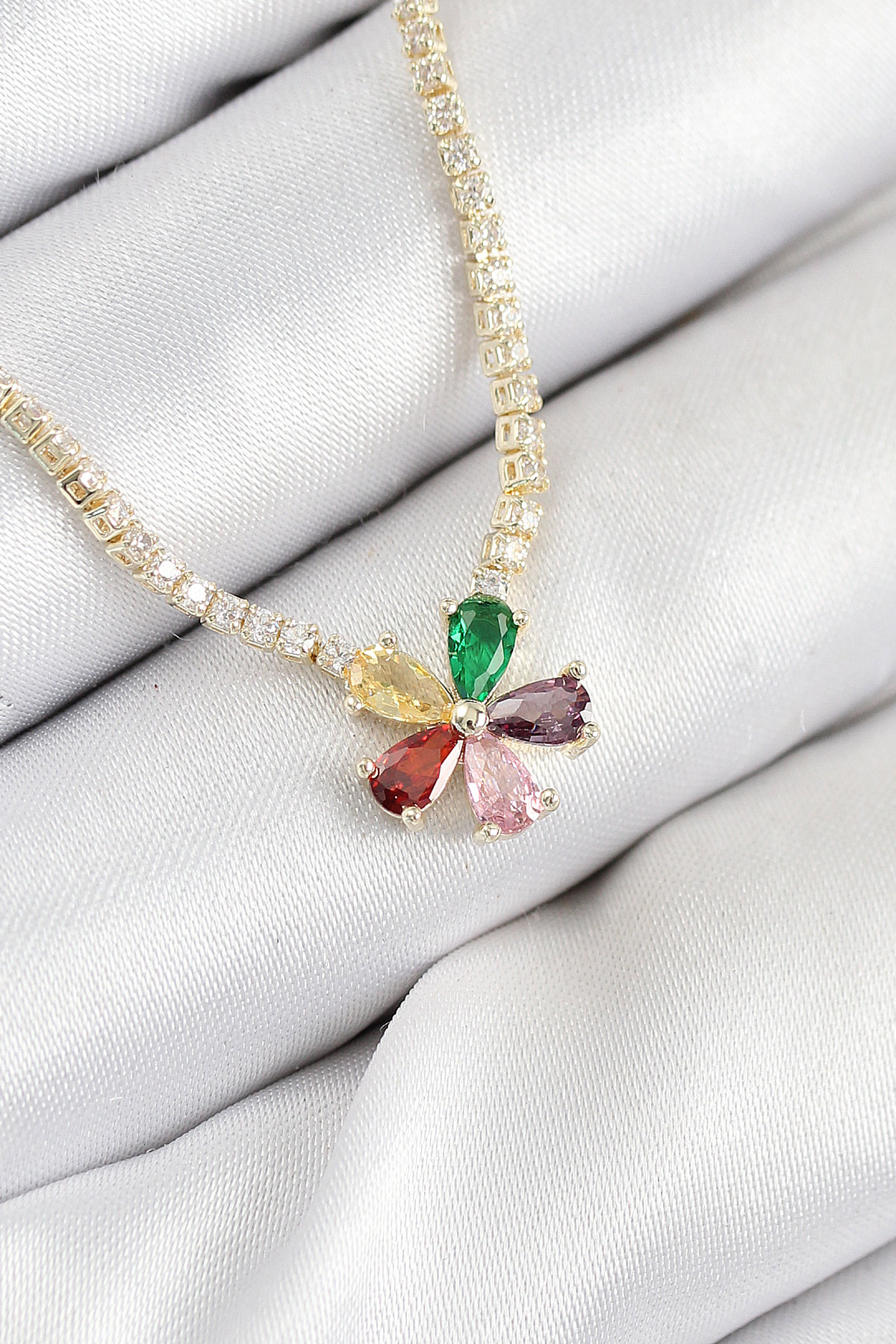 Pirinç Zirkon Taşlı Su Yolu Asorti Çiçek Model Gold Renk Kadın Kolye